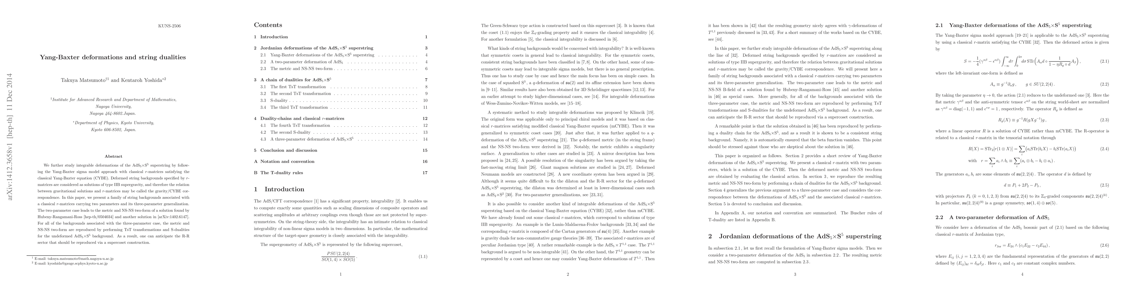 We further study integrable deformations of the AdS$_5\times$S$^5$ superstring by following the Yang-Baxter sigma model approach with classical $r$-matrices satisfying the classical Yang-Baxter equation (CYBE). Deformed string backgrounds specified by $r$-matrices are considered as solutions of type IIB supergravity, and therefore the relation between gravitational solutions and $r$-matrices may be called the gravity/CYBE correspondence. In this paper, we present a family of string backgrounds associated with a classical $r$-matrices carrying two parameters and its three-parameter generalization. The two-parameter case leads to the metric and NS-NS two-form of a solution found by Hubeny-Rangamani-Ross [hep-th/0504034] and another solution in [arXiv:1402.6147]. For all of the backgrounds associated with the three-parameter case, the metric and NS-NS two-form are reproduced by performing TsT transformations and S-dualities for the undeformed AdS$_5\times$S$^5$ background. As a result, one can anticipate the R-R sector that should be reproduced via a supercoset construction.