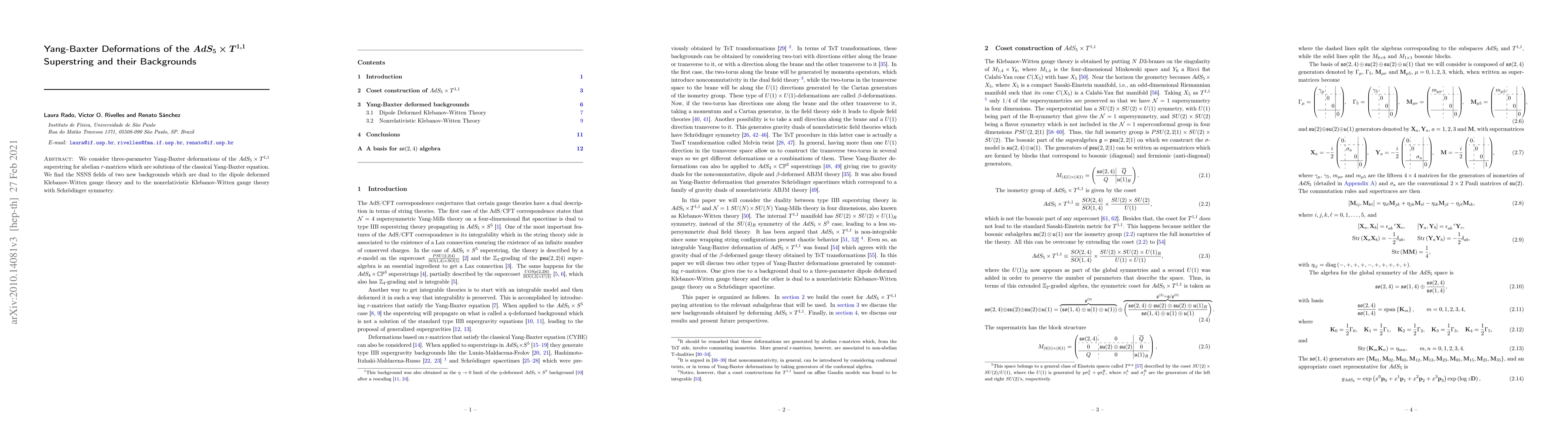 This research explores three-parameter Yang-Baxter deformations of the $AdS_5\times T^{1,1}$ superstring, identifying two new dual backgrounds linked to dipole deformed and nonrelativistic Klebanov-Witten gauge theories.
