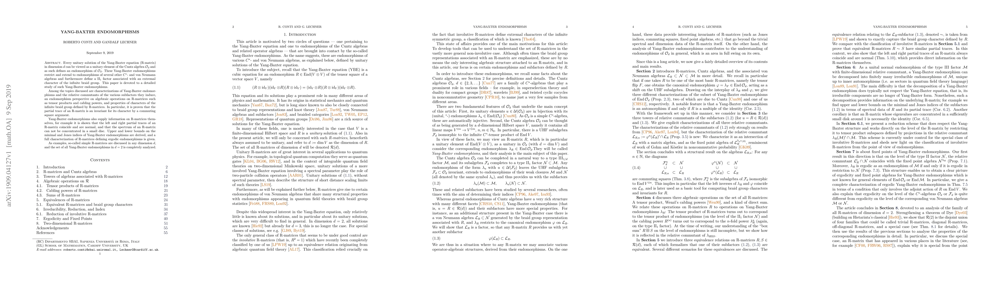 This paper studies Yang-Baxter endomorphisms arising from unitary solutions of the Yang-Baxter equation, exploring their properties, characterizations, and connections to $C^*$- and von Neumann algebras, including their role in defining a II$_1$ factor linked to the infinite braid group. It also investigates the algebraic operations on R-matrices and their invariants, providing bounds on indices and characterizing ergodic endomorphisms.