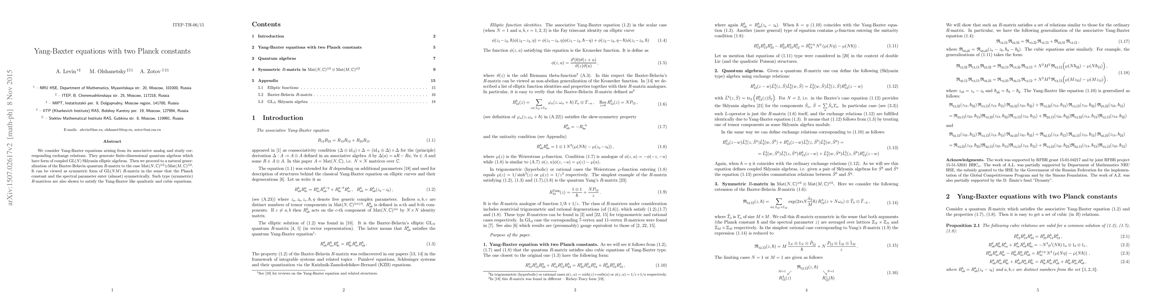 We consider Yang-Baxter equations arising from its associative analog and study corresponding exchange relations. They generate finite-dimensional quantum algebras which have form of coupled ${\rm GL}(N)$ Sklyanin elliptic algebras. Then we proceed to a natural generalization of the Baxter-Belavin quantum $R$-matrix to the case ${\rm Mat}(N,\mathbb C)^{\otimes 2}\otimes {\rm Mat}(M,\mathbb C)^{\otimes 2}$. It can be viewed as symmetric form of ${\rm GL}(NM)$ $R$-matrix in the sense that the Planck constant and the spectral parameter enter (almost) symmetrically. Such type (symmetric) $R$-matrices are also shown to satisfy the Yang-Baxter like quadratic and cubic equations.