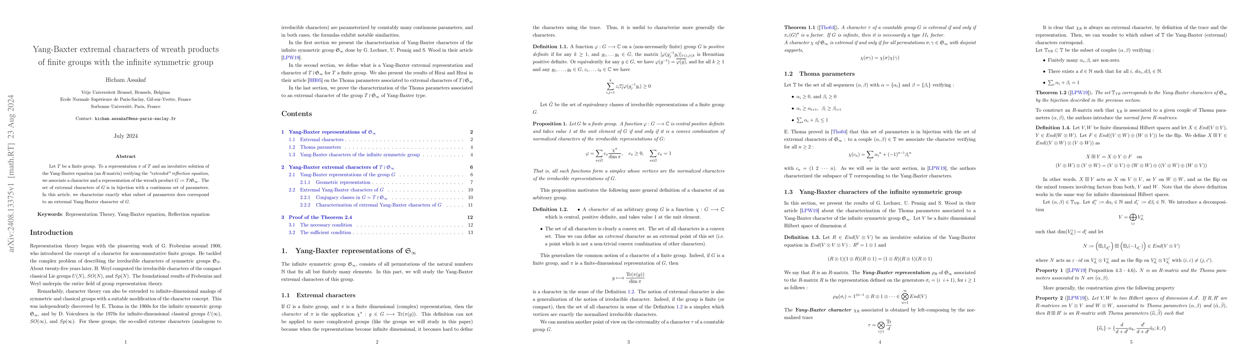 Let $T$ be a finite group. To a representation $\pi$ of $T$ and an involutive solution of the Yang-Baxter equation (an $R$-matrix) verifying the "extended" reflection equation, we associate a character and a representation of the wreath product $G:=T\wr \mathfrak{S}_\infty$. The set of extremal characters of $G$ is in bijection with a continuous set of parameters. In this article, we characterize exactly what subset of parameters does correspond to an extremal Yang-Baxter character of $G$.