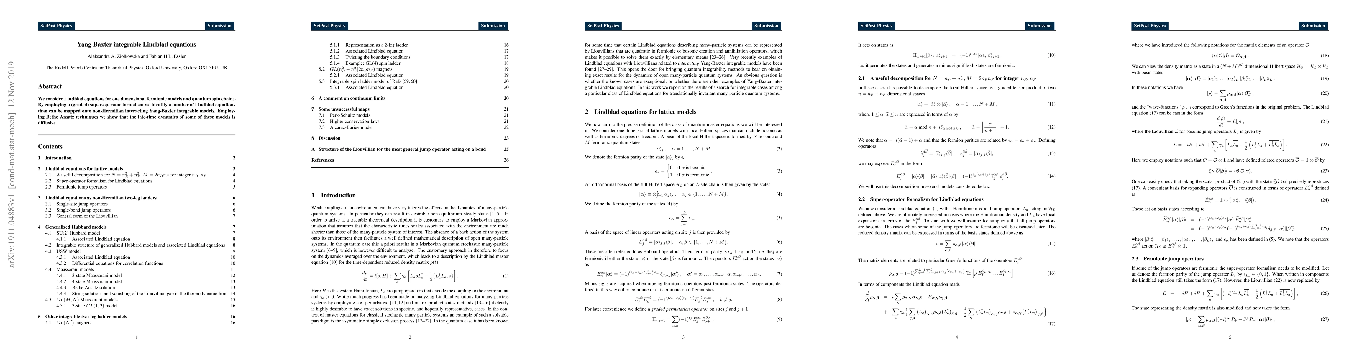 This paper explores integrable Lindblad equations for fermionic models and quantum spin chains, mapping them onto non-Hermitian interacting Yang-Baxter systems. Using Bethe Ansatz techniques, it demonstrates that the late-time dynamics of certain models exhibit diffusive behavior.