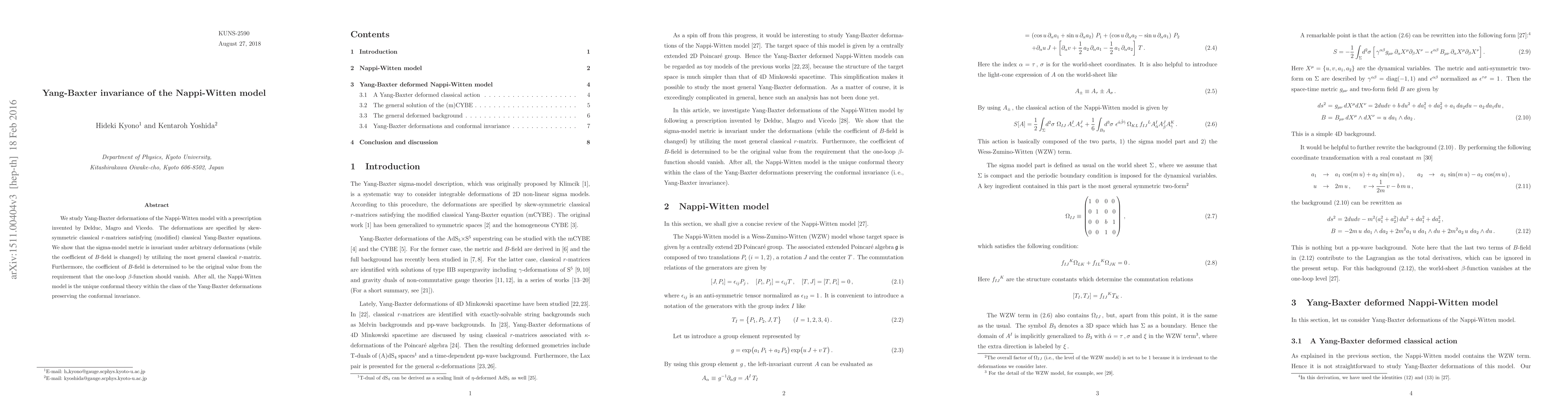 This paper explores Yang-Baxter deformations of the Nappi-Witten model using a prescription by Delduc, Magro, and Vicedo, showing that the sigma-model metric remains invariant while the $B$-field coefficient changes. The Nappi-Witten model stands out as the sole conformal theory among Yang-Baxter deformations when the one-loop $\beta$-function vanishes.