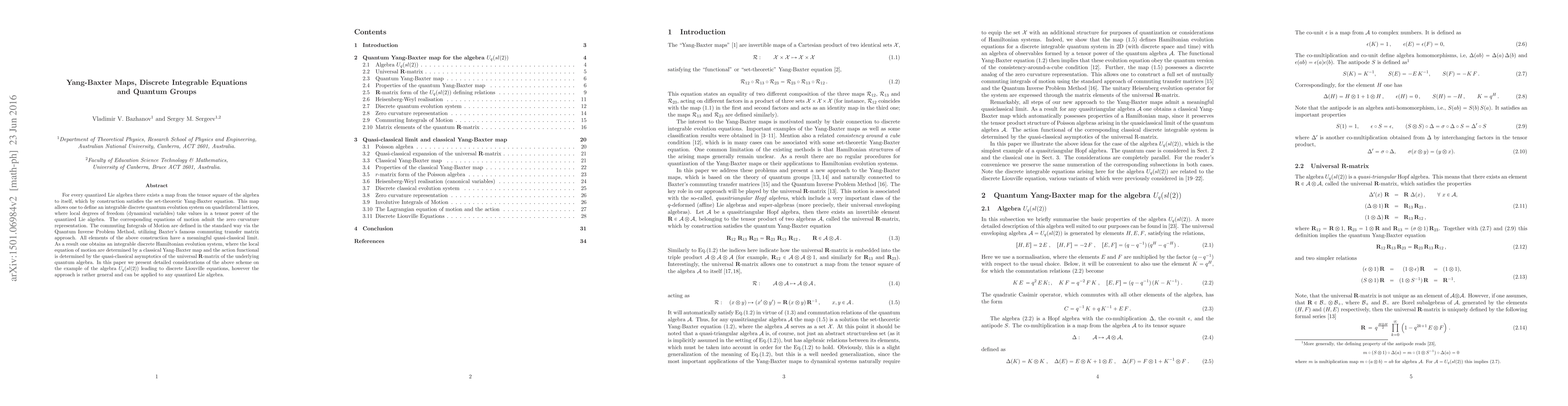 For every quantized Lie algebra there exists a map from the tensor square of the algebra to itself, which by construction satisfies the set-theoretic Yang-Baxter equation. This map allows one to define an integrable discrete quantum evolution system on quadrilateral lattices, where local degrees of freedom (dynamical variables) take values in a tensor power of the quantized Lie algebra. The corresponding equations of motion admit the zero curvature representation. The commuting Integrals of Motion are defined in the standard way via the Quantum Inverse Problem Method, utilizing Baxter's famous commuting transfer matrix approach. All elements of the above construction have a meaningful quasi-classical limit. As a result one obtains an integrable discrete Hamiltonian evolution system, where the local equation of motion are determined by a classical Yang-Baxter map and the action functional is determined by the quasi-classical asymptotics of the universal R-matrix of the underlying quantum algebra. In this paper we present detailed considerations of the above scheme on the example of the algebra $U_q(sl(2))$ leading to discrete Liouville equations, however the approach is rather general and can be applied to any quantized Lie algebra.