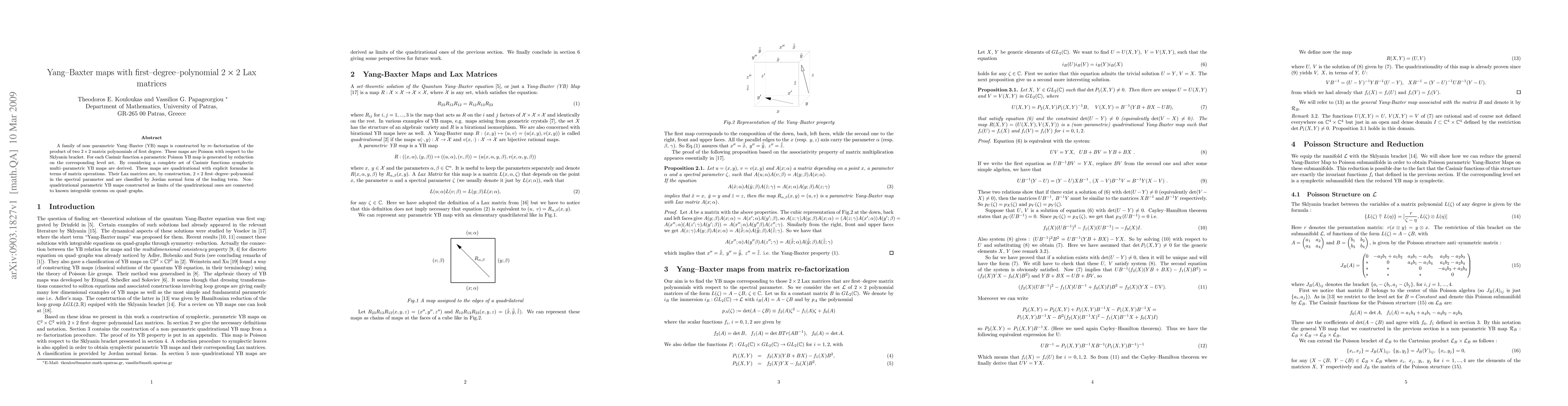 This paper constructs nonparametric Yang Baxter maps using first degree polynomial 2 by 2 Lax matrices, showing they are Poisson with respect to the Sklyanin bracket. It derives quadrirational maps from Casimir functions and classifies them based on the Jordan normal form of their leading terms.