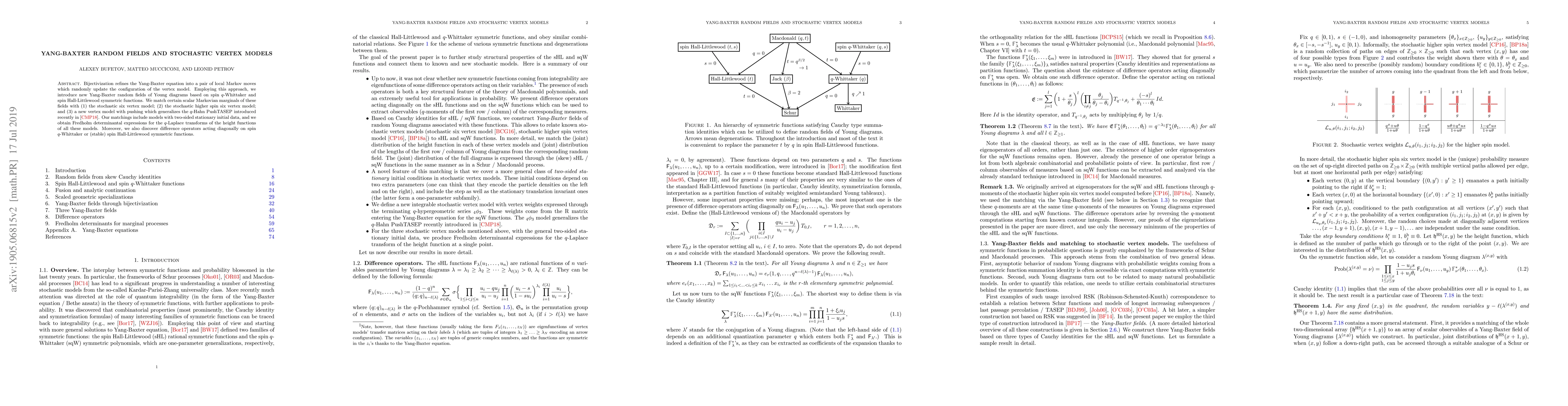 Bijectivization refines the Yang-Baxter equation into a pair of local Markov moves which randomly update the configuration of the vertex model. Employing this approach, we introduce new Yang-Baxter random fields of Young diagrams based on spin $q$-Whittaker and spin Hall-Littlewood symmetric functions. We match certain scalar Markovian marginals of these fields with (1) the stochastic six vertex model; (2) the stochastic higher spin six vertex model; and (3) a new vertex model with pushing which generalizes the $q$-Hahn PushTASEP introduced recently by Corwin-Matveev-Petrov (arXiv:1811.06475). Our matchings include models with two-sided stationary initial data, and we obtain Fredholm determinantal expressions for the $q$-Laplace transforms of the height functions of all these models. Moreover, we also discover difference operators acting diagonally on spin $q$-Whittaker or (stable) spin Hall-Littlewood symmetric functions.