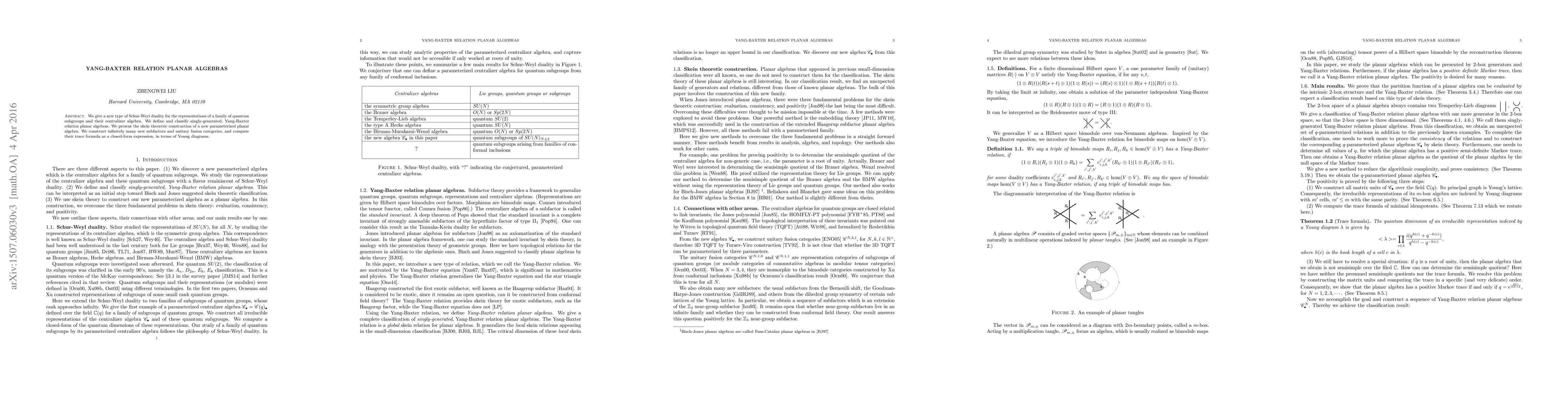 This paper presents a novel Schur-Weyl duality for quantum subgroups and their centralizer algebra, defining and classifying singly-generated Yang-Baxter relation planar algebras. It also constructs new parameterized planar algebras via skein theory and computes the trace formula for new subfactors and unitary fusion categories in terms of Young diagrams.
