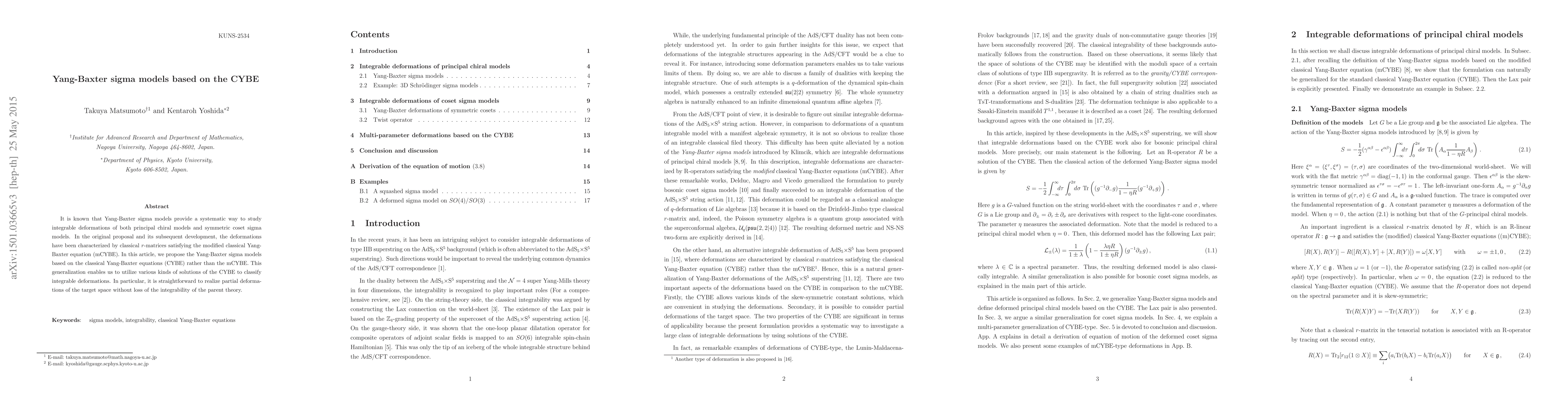 It is known that Yang-Baxter sigma models provide a systematic way to study integrable deformations of both principal chiral models and symmetric coset sigma models. In the original proposal and its subsequent development, the deformations have been characterized by classical $r$-matrices satisfying the modified classical Yang-Baxter equation (mCYBE). In this article, we propose the Yang-Baxter sigma models based on the classical Yang-Baxter equations (CYBE) rather than the mCYBE. This generalization enables us to utilize various kinds of solutions of the CYBE to classify integrable deformations. In particular, it is straightforward to realize partial deformations of the target space without loss of the integrability of the parent theory.