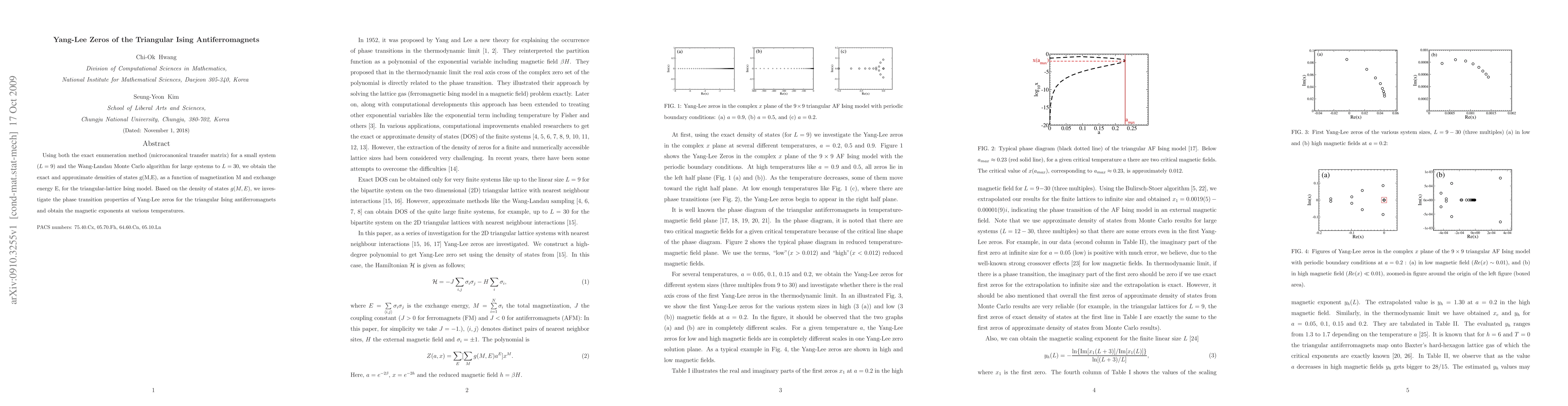 This research calculates the densities of states for the triangular-lattice Ising model using exact enumeration and Monte Carlo methods, then analyzes the Yang-Lee zeros and magnetic exponents to understand phase transition properties in triangular Ising antiferromagnets.
