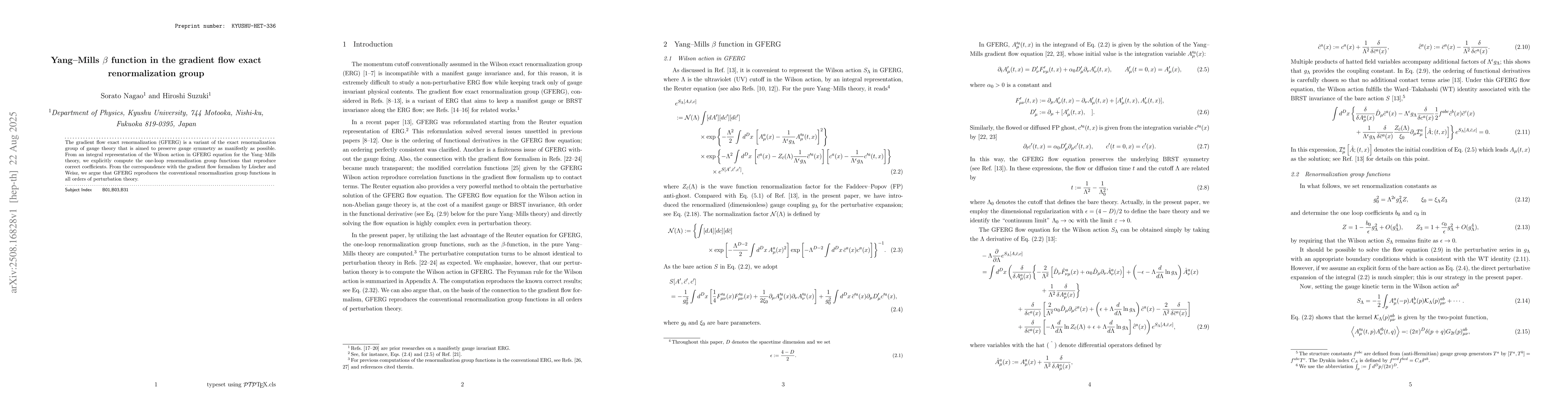 The gradient flow exact renormalization (GFERG) is a variant of the exact renormalization group of gauge theory that is aimed to preserve gauge symmetry as manifestly as possible. From an integral representation of the Wilson action in GFERG equation for the Yang--Mills theory, we explicitly compute the one-loop renormalization group functions that reproduce correct coefficients. From the correspondence with the gradient flow formalism by L\"uscher and Weisz, we argue that GFERG reproduces the conventional renormalization group functions in all orders of perturbation theory.