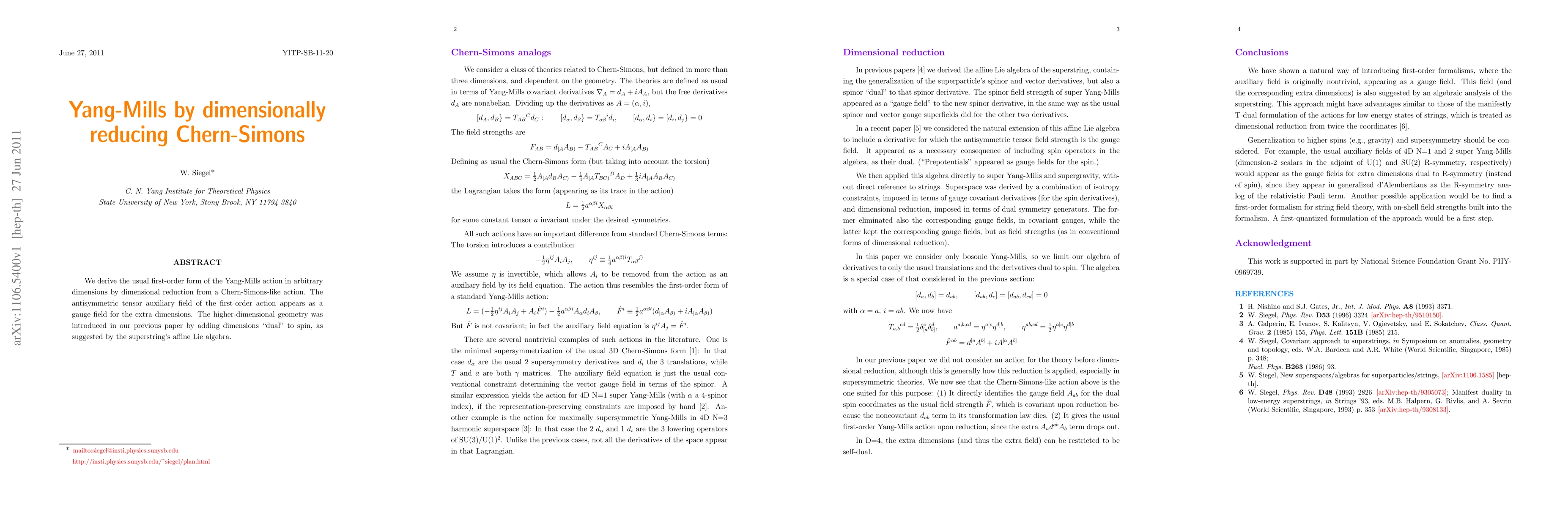 We derive the usual first-order form of the Yang-Mills action in arbitrary dimensions by dimensional reduction from a Chern-Simons-like action. The antisymmetric tensor auxiliary field of the first-order action appears as a gauge field for the extra dimensions. The higher-dimensional geometry was introduced in our previous paper by adding dimensions "dual" to spin, as suggested by the superstring's affine Lie algebra.