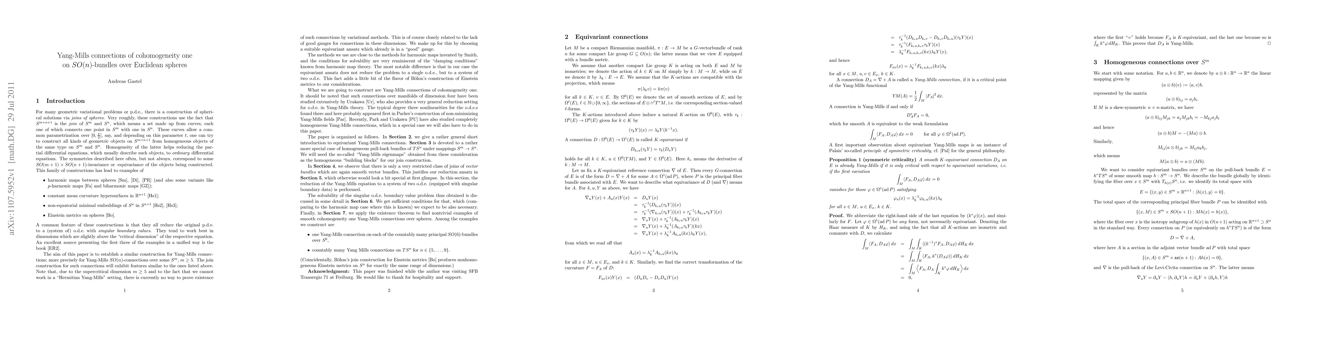 This paper constructs Yang-Mills connections on SO(n)-bundles over spheres, employing a cohomogeneity one group action to reduce the Yang-Mills equation to ODEs, with solutions found via variational methods inspired by harmonic map theory. Examples include principal SO(6)-bundles over $S^6$ and Yang-Mills connections on tangent bundles of spheres for $n\in\{5,...,9\}$.