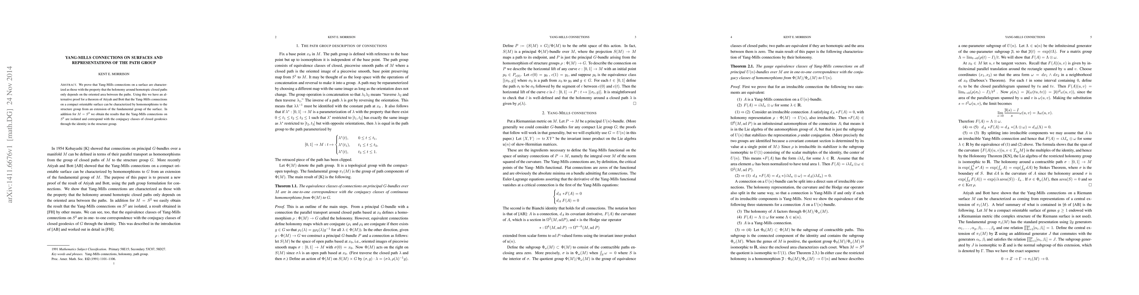 This paper proves that Yang-Mills connections on surfaces depend only on the oriented area between homotopic closed paths, providing an alternative proof for Atiyah and Bott's theorem on these connections' characterization by homomorphisms to the structure group. It also finds that Yang-Mills connections on the sphere correspond to conjugacy classes of closed geodesics.