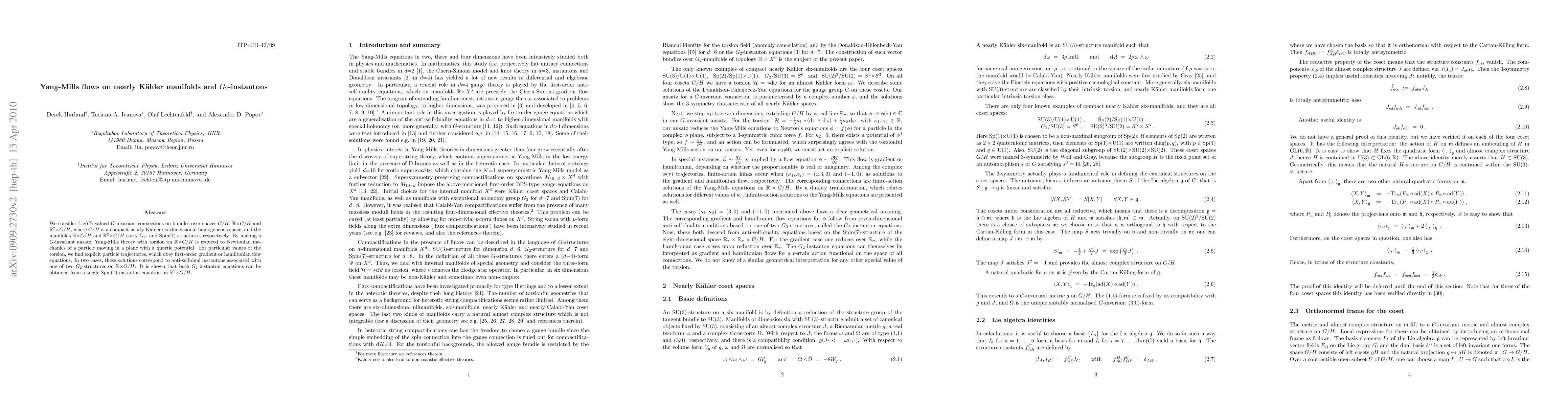 This paper investigates Yang-Mills flows on nearly Kähler manifolds and explores G_2-instantons through a Lie(G)-valued G-invariant connection approach. The study reveals that these flows reduce to Newtonian mechanics, with solutions corresponding to anti-self-dual instantons linked to G_2 structures.