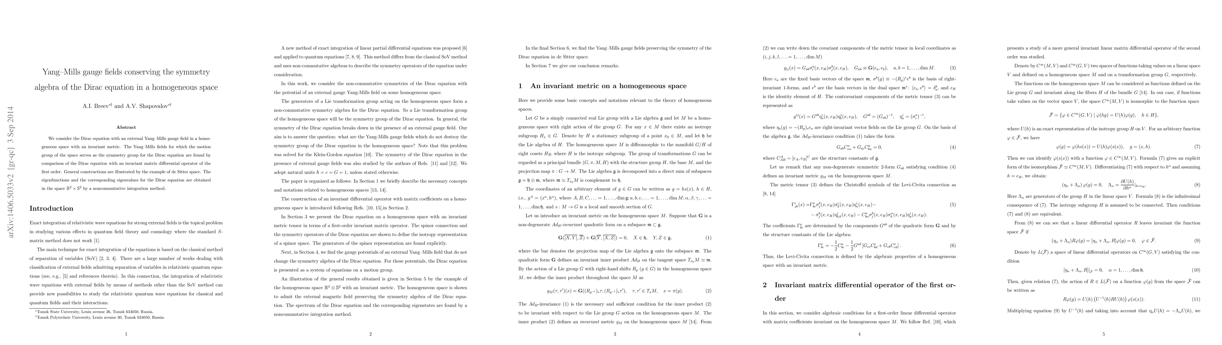 This paper investigates the Dirac equation in a homogeneous space with an invariant metric, incorporating Yang-Mills gauge fields that preserve the symmetry algebra. It identifies Yang-Mills fields where the motion group of the space matches the symmetry group for the Dirac equation and derives eigenfunctions and eigenvalues using a noncommutative integration method in $\mathbb{R}^2\times \mathbb{S}^2$.