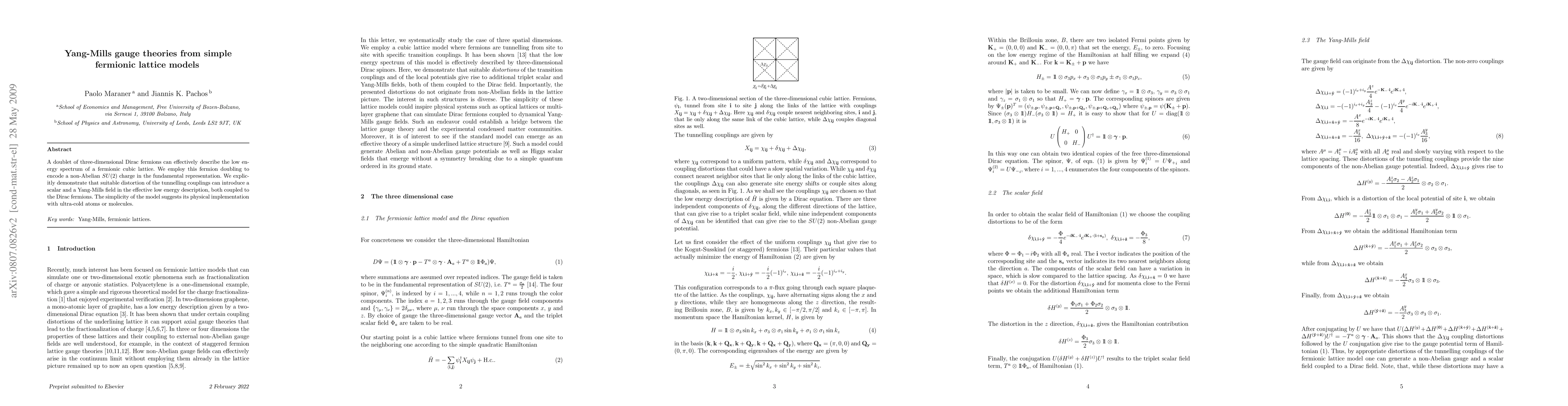 A doublet of three-dimensional Dirac fermions can effectively describe the low energy spectrum of a fermionic cubic lattice. We employ this fermion doubling to encode a non-Abelian SU(2) charge in the fundamental representation. We explicitly demonstrate that suitable distortion of the tunnelling couplings can introduce a scalar and a Yang-Mills field in the effective low energy description, both coupled to the Dirac fermions. As an application we simulate Yang-Mills monopoles that give rise to localized zero-modes and fermion fractionalization. The generation of the non-Abelian field in the two-dimensional case is also presented.