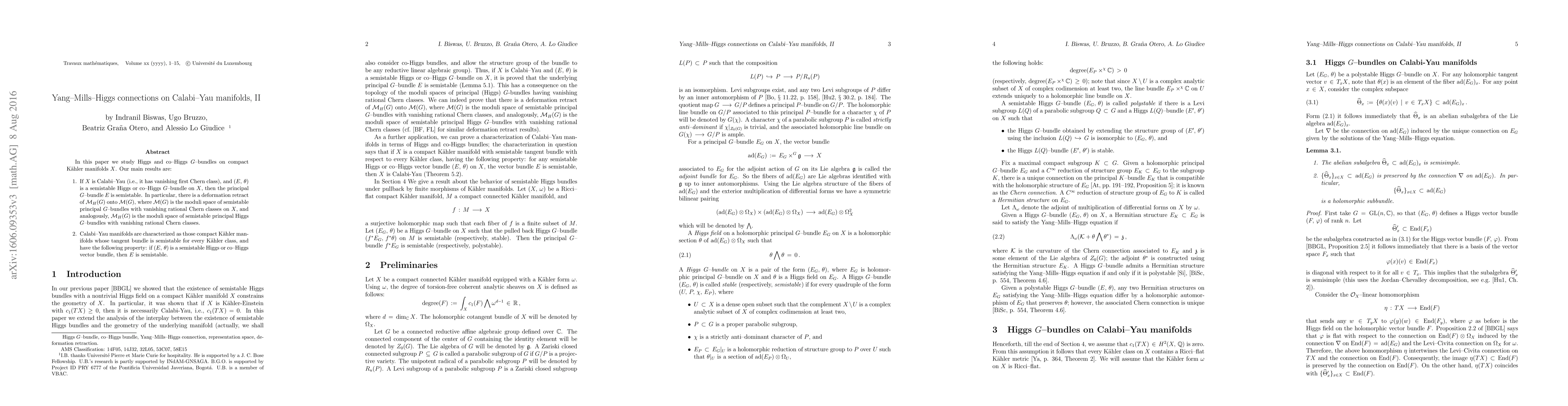 In this paper we study Higgs and co-Higgs $G$-bundles on compact K\"ahler manifolds $X$. Our main results are: (1) If $X$ is Calabi-Yau, and $(E,\,\theta)$ is a semistable Higgs or co-Higgs $G$-bundle on $X$, then the principal $G$-bundle $E$ is semistable. In particular, there is a deformation retract of ${\mathcal M}_H(G)$ onto $\mathcal M(G)$, where $\mathcal M(G)$ is the moduli space of semistable principal $G$-bundles with vanishing rational Chern classes on $X$, and analogously, ${\mathcal M}_H(G)$ is the moduli space of semistable principal Higgs $G$-bundles with vanishing rational Chern classes. (2) Calabi-Yau manifolds are characterized as those compact K\"ahler manifolds whose tangent bundle is semistable for every K\"ahler class, and have the following property: if $(E,\,\theta)$ is a semistable Higgs or co-Higgs vector bundle, then $E$ is semistable.
