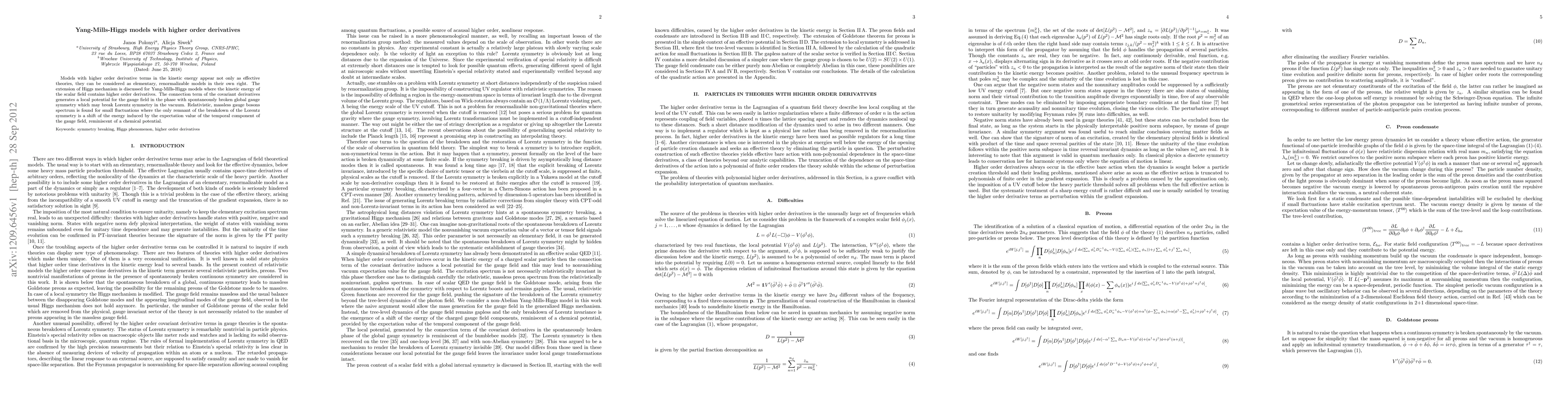 Models with higher order derivative terms in the kinetic energy appear not only as effective theories, they can be considered as elementary, renormalizable models in their own right. The extension of Higgs mechanism is discussed for Yang-Mills-Higgs models where the kinetic energy of the scalar field contains higher order derivatives. The connection term of the covariant derivatives generates a local potential for the gauge field in the phase with spontaneously broken global gauge symmetry which may break Lorentz symmetry in the vacuum. Relativistic, massless gauge bosons spectrum is found for small fluctuations where the only remnant of the breakdown of the Lorentz symmetry is a shift of the energy induced by the expectation value of the temporal component of the gauge field, reminiscent of a chemical potential.