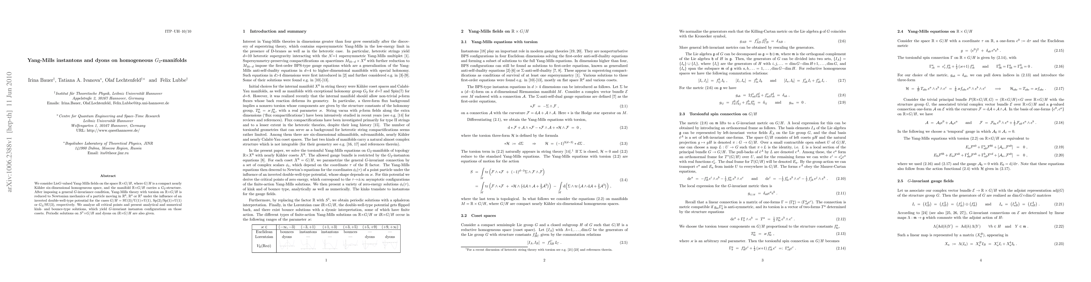This paper studies Yang-Mills fields on R x G/H with G_2-structure, reducing the theory to Newtonian mechanics for specific cosets. It reveals G-invariant instanton configurations, kink- and bounce-type solutions, and periodic solutions, including dyons on iR x G/H.