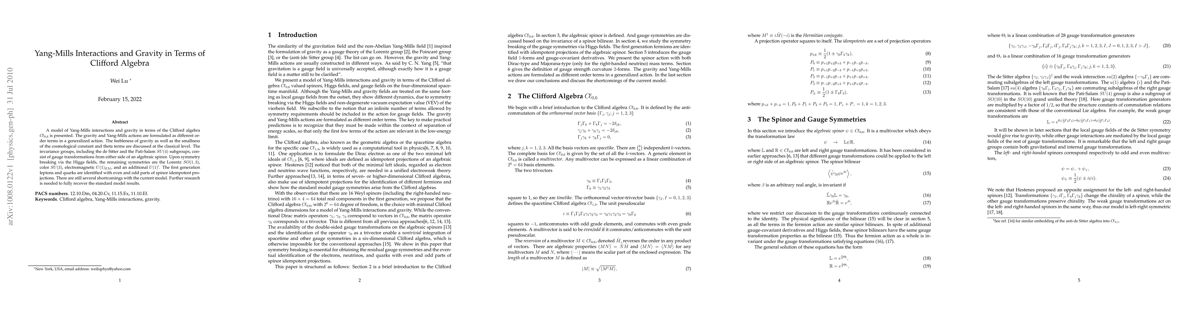 This paper presents a model unifying Yang-Mills interactions and gravity using Clifford algebra Cl(0,6), discussing the feebleness of gravity and cosmological constants. It identifies symmetries and elementary particles via spinor idempotent projections, but acknowledges current model inadequacies and calls for further research.