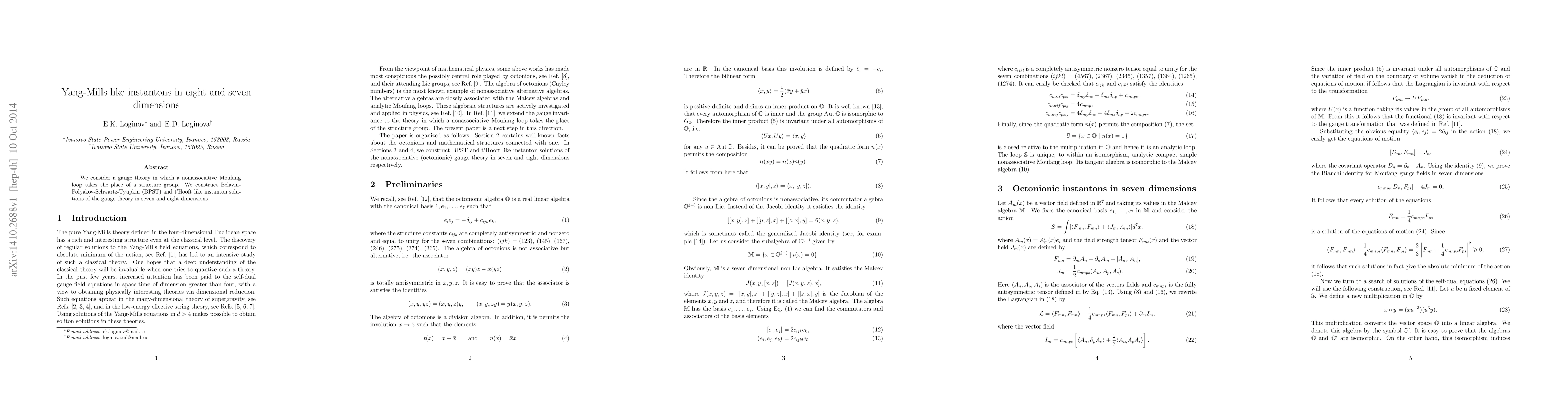 This paper constructs instanton solutions in gauge theories based on nonassociative Moufang loops in seven and eight dimensions, akin to BPST and t'Hooft solutions, exploring their implications for higher-dimensional gauge dynamics.