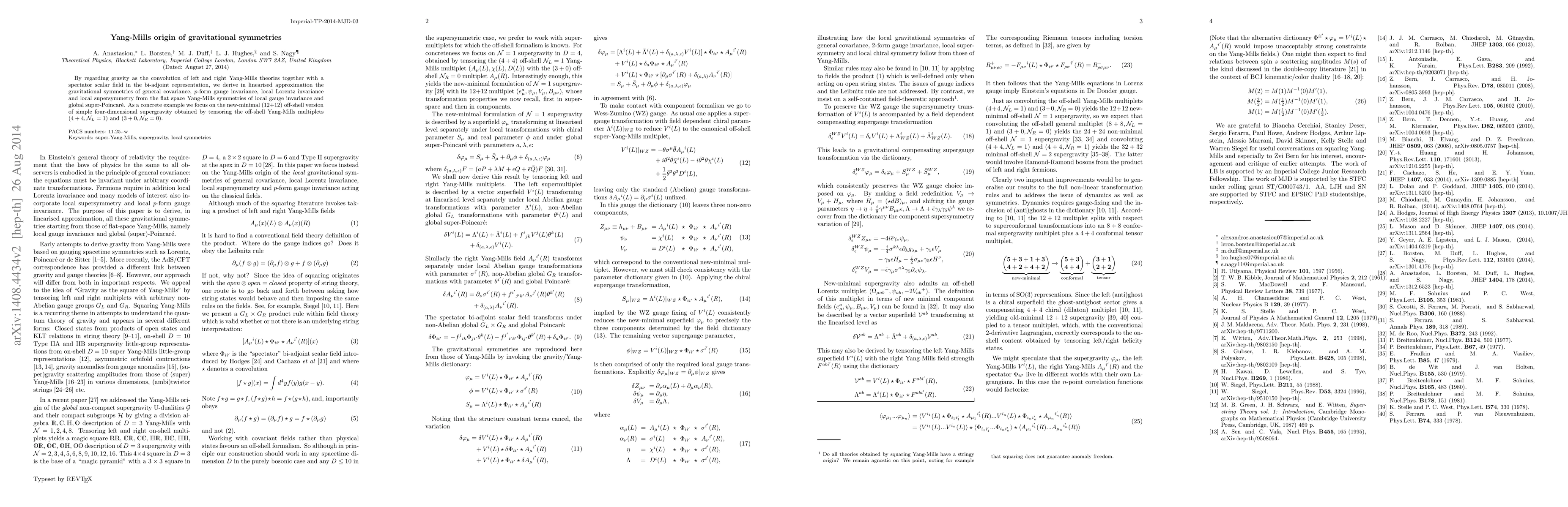 This paper derives the symmetries of general relativity from the convolution of left and right Yang-Mills theories with a scalar field, showing the emergence of general covariance, p-form gauge invariance, local Lorentz invariance, and local supersymmetry from flat space Yang-Mills symmetries. It specifically examines the new-minimal four-dimensional supergravity derived from off-shell Yang-Mills multiplets.