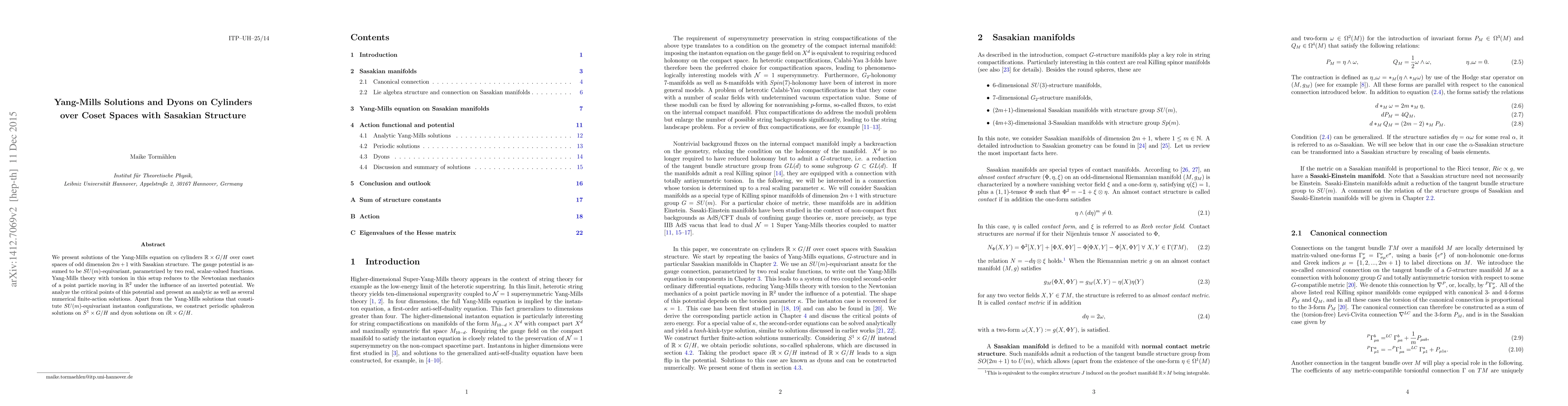 This paper explores Yang-Mills solutions on $\mathbb R\times G/H$ cylinders with Sasakian structure in odd dimensions, focusing on $SU(m)$-equivariant configurations. It also investigates periodic sphaleron and dyon solutions, linking these to Newtonian mechanics and presenting both analytical and numerical finite-action solutions.