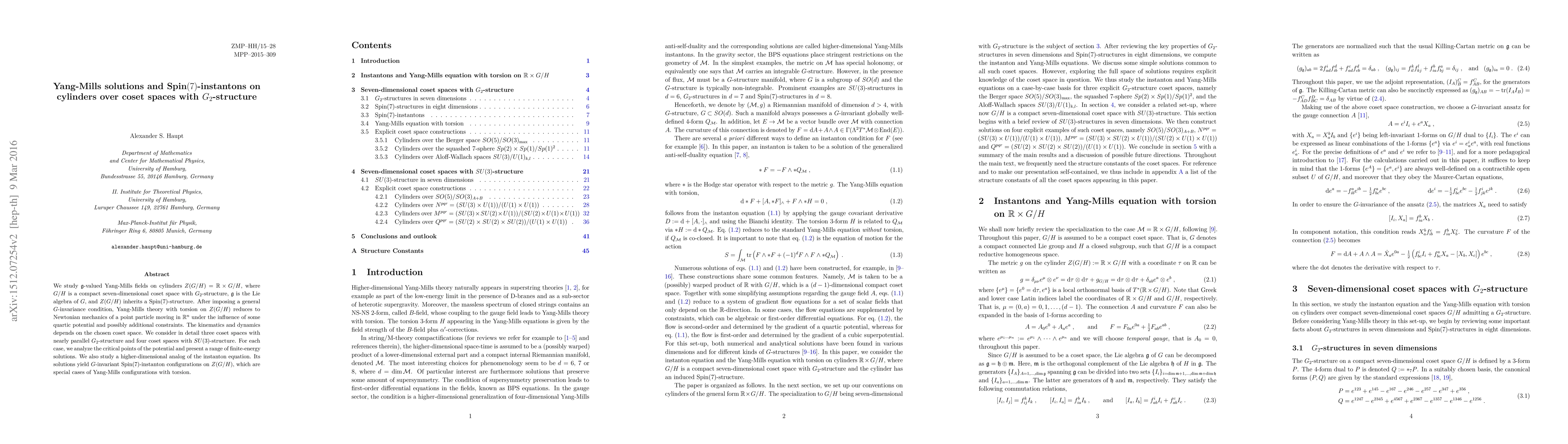 This paper investigates $\mathfrak{g}$-valued Yang-Mills fields on cylinders over seven-dimensional coset spaces with $G_2$-structure, leading to a Newtonian mechanics interpretation. It analyzes finite-energy solutions and Spin(7)-instanton configurations for specific coset spaces.