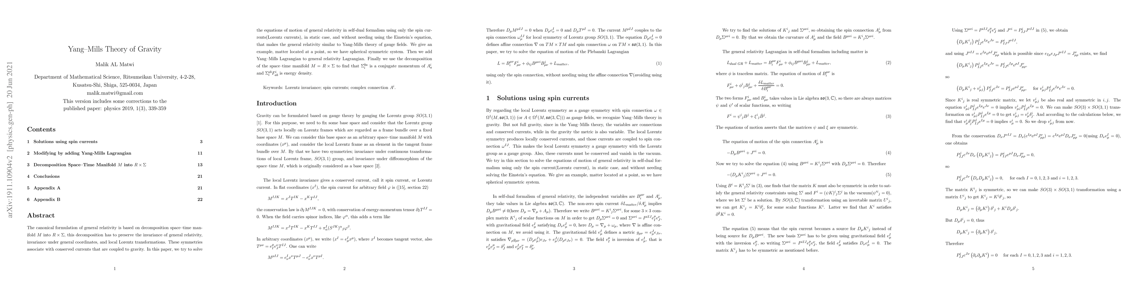 The canonical formulation of general relativity is based on decomposition space--time manifold $M$ into $ R\times \Sigma$, this decomposition has to preserve the invariance of general relativity, invariance under general coordinates, and local Lorentz transformations. These symmetries associate with conserved currents that are coupled to gravity. In this paper, we try to solve the equations of motion of general relativity in self-dual formalism using only the spin currents(Lorentz currents), in static case, and without needing using the Einstein's equation, that makes the general relativity similar to Yang-Mills theory of gauge fields. We give an example, matter located at a point, so we have spherical symmetric system. Then we add Yang--Mills Lagrangian to general relativity Lagrangian. Finally we use the decomposition of the space--time manifold $M=R\times \Sigma$ to find that $\Sigma^{0a}_i$ is a conjugate momentum of $A^{i}_a$ and $\Sigma^{ab}_i F_{ab}^i$ is energy density.