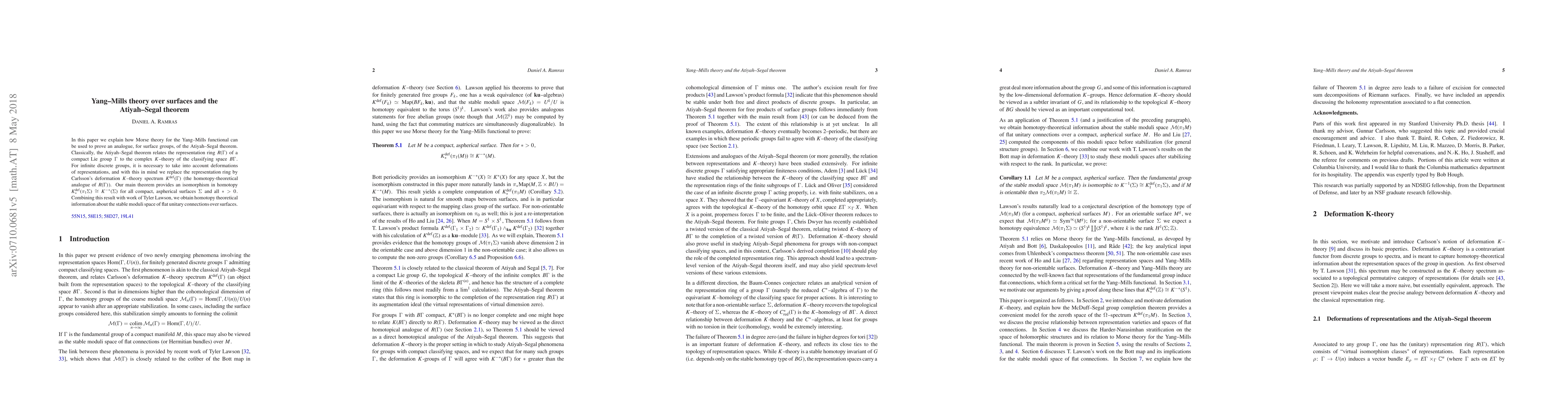 In this paper we explain how Morse theory for the Yang-Mills functional can be used to prove an analogue, for surface groups, of the Atiyah-Segal theorem. Classically, the Atiyah-Segal theorem relates the representation ring R(\Gamma) of a compact Lie group $\Gamma$ to the complex K-theory of the classifying space $B\Gamma$. For infinite discrete groups, it is necessary to take into account deformations of representations, and with this in mind we replace the representation ring by Carlsson's deformation $K$--theory spectrum $\K (\Gamma)$ (the homotopy-theoretical analogue of $R(\Gamma)$). Our main theorem provides an isomorphism in homotopy $\K_*(\pi_1 \Sigma)\isom K^{-*}(\Sigma)$ for all compact, aspherical surfaces $\Sigma$ and all $*>0$. Combining this result with work of Tyler Lawson, we obtain homotopy theoretical information about the stable moduli space of flat unitary connections over surfaces.