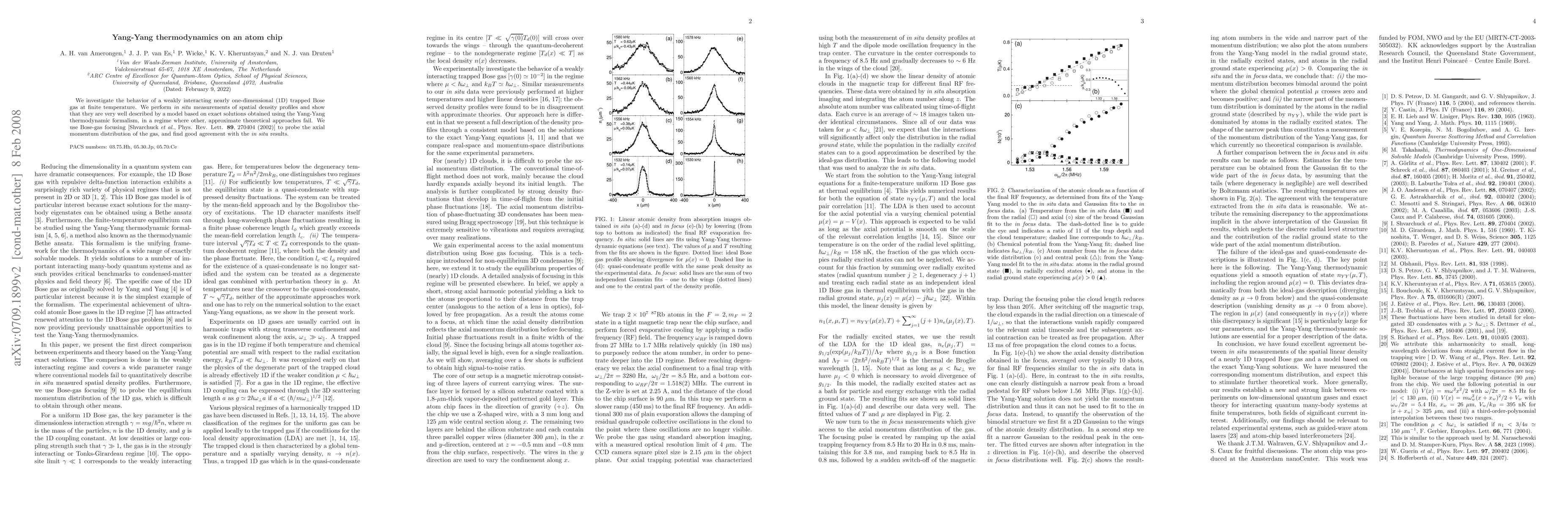 We investigate the behavior of a weakly interacting nearly one-dimensional (1D) trapped Bose gas at finite temperature. We perform in situ measurements of spatial density profiles and show that they are very well described by a model based on exact solutions obtained using the Yang-Yang thermodynamic formalism, in a regime where other, approximate theoretical approaches fail. We use Bose-gas focusing [Shvarchuck etal., Phys. Rev. Lett. 89, 270404 (2002)] to probe the axial momentum distribution of the gas, and find good agreement with the in situ results.
