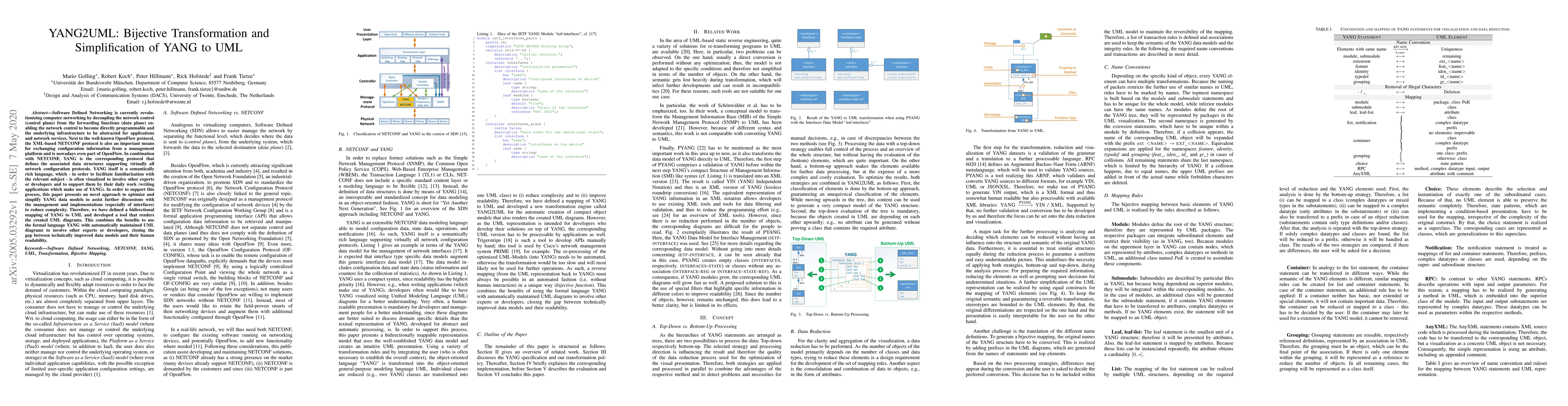 Software Defined Networking is currently revolutionizing computer networking by decoupling the network control (control plane) from the forwarding functions (data plane) enabling the network control to become directly programmable and the underlying infrastructure to be abstracted for applications and network services. Next to the well-known OpenFlow protocol, the XML-based NETCONF protocol is also an important means for exchanging configuration information from a management platform and is nowadays even part of OpenFlow. In combination with NETCONF, YANG is the corresponding protocol that defines the associated data structures supporting virtually all network configuration protocols. YANG itself is a semantically rich language, which -- in order to facilitate familiarization with the relevant subject -- is often visualized to involve other experts or developers and to support them by their daily work (writing applications which make use of YANG). In order to support this process, this paper presents an novel approach to optimize and simplify YANG data models to assist further discussions with the management and implementations (especially of interfaces) to reduce complexity. Therefore, we have defined a bidirectional mapping of YANG to UML and developed a tool that renders the created UML diagrams. This combines the benefits to use the formal language YANG with automatically maintained UML diagrams to involve other experts or developers, closing the gap between technically improved data models and their human readability.