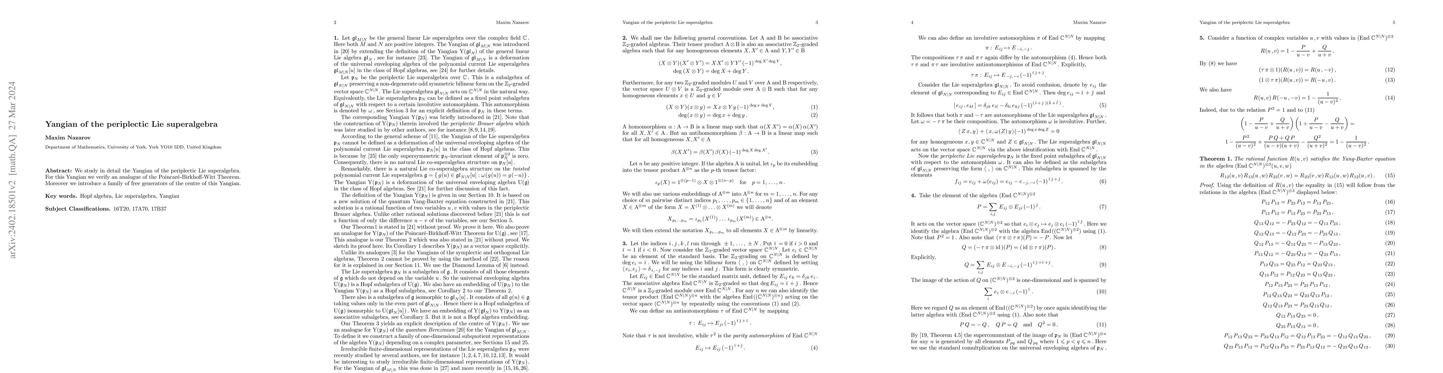 This paper explores the Yangian of the periplectic Lie superalgebra, proving a Poincaré-Birkhoff-Witt Theorem analogue and identifying a set of free generators for its center.