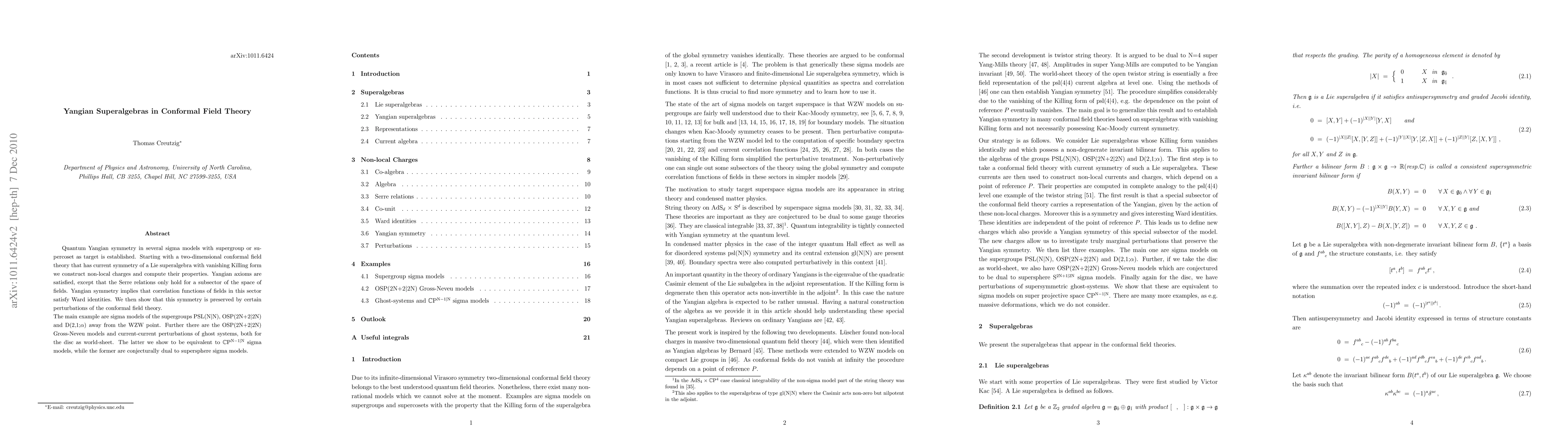 Quantum Yangian symmetry in several sigma models with supergroup or supercoset as target is established. Starting with a two-dimensional conformal field theory that has current symmetry of a Lie superalgebra with vanishing Killing form we construct non-local charges and compute their properties. Yangian axioms are satisfied, except that the Serre relations only hold for a subsector of the space of fields. Yangian symmetry implies that correlation functions of fields in this sector satisfy Ward identities. We then show that this symmetry is preserved by certain perturbations of the conformal field theory. The main example are sigma models of the supergroups PSL(N|N), OSP(2N+2|2N) and D(2,1;\alpha) away from the WZW point. Further there are the OSP(2N+2|2N) Gross-Neveu models and current-current perturbations of ghost systems, both for the disc as world-sheet. The latter we show to be equivalent to CP^{N-1|N} sigma models, while the former are conjecturally dual to supersphere sigma models.
