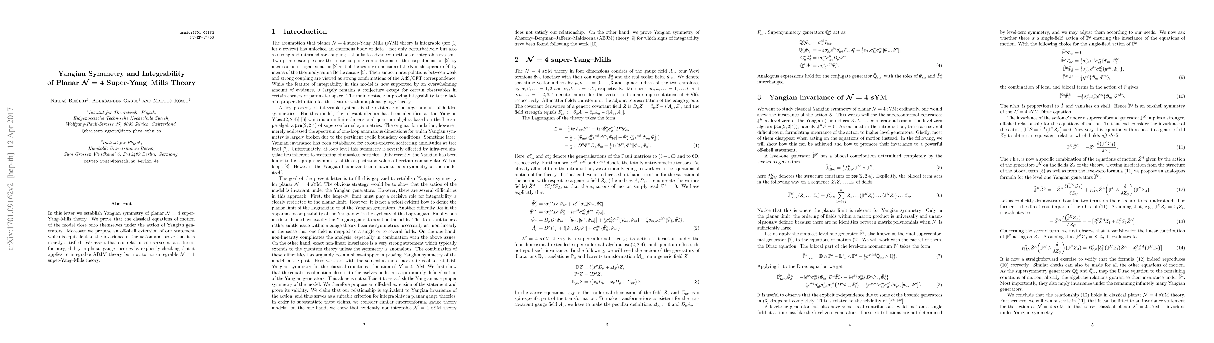 The paper establishes Yangian symmetry in planar N=4 super-Yang-Mills theory, demonstrating that the classical equations of motion close under Yangian generators. It also extends this to an off-shell condition proving the invariance of the action, and proposes this relationship as a criterion for integrability.