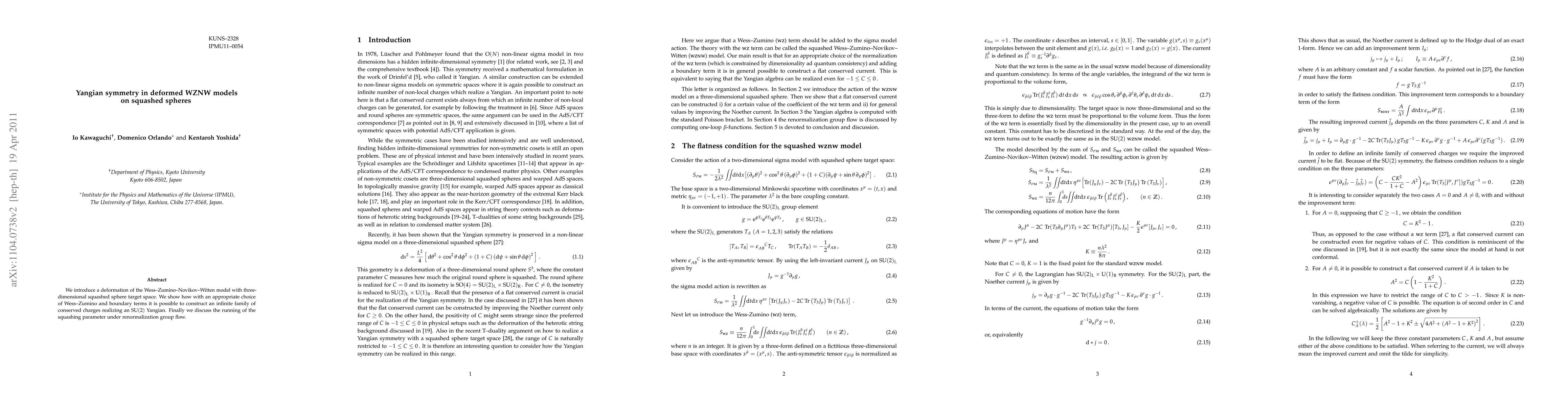 This paper introduces a deformed Wess-Zumino-Novikov-Witten model on a three-dimensional squashed sphere, demonstrating the construction of an infinite family of conserved charges that realize an SU(2) Yangian symmetry. It also examines the behavior of the squashing parameter under renormalization group flow.