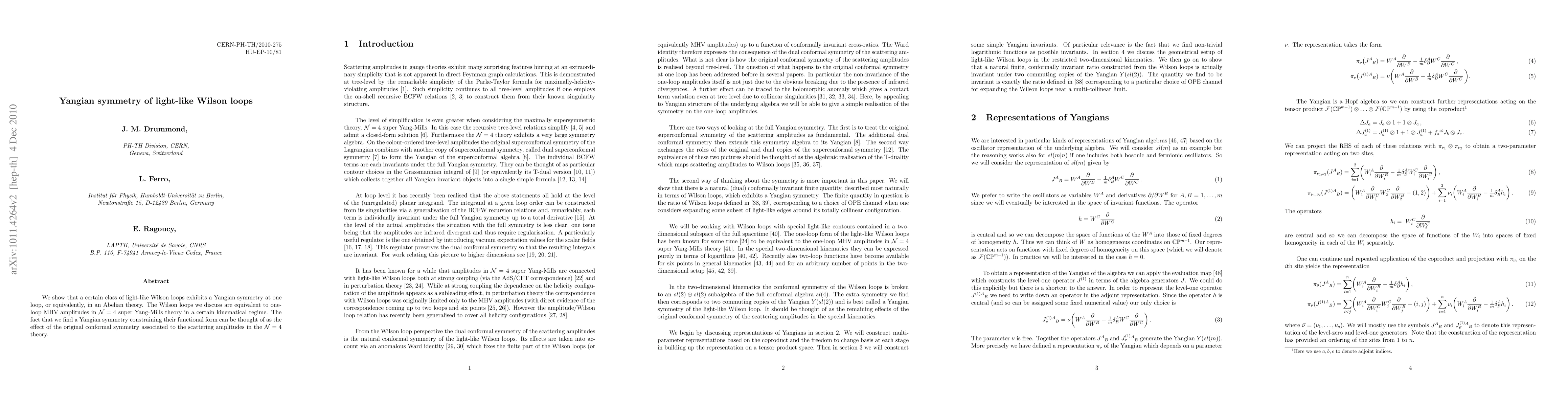 This paper demonstrates that light-like Wilson loops possess a Yangian symmetry at one loop, akin to an Abelian theory, and are equivalent to one-loop MHV amplitudes in N=4 super Yang-Mills theory, indicating the influence of the original conformal symmetry on scattering amplitudes.