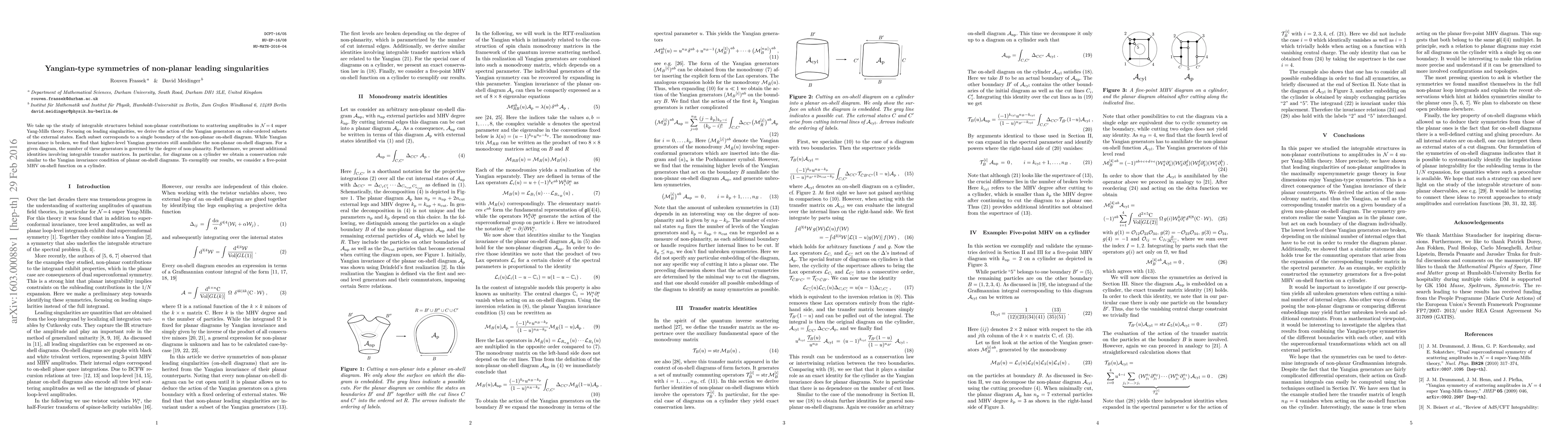 We take up the study of integrable structures behind non-planar contributions to scattering amplitudes in N=4 super Yang-Mills theory. Focusing on leading singularities, we derive the action of the Yangian generators on color-ordered subsets of the external states. Each subset corresponds to a single boundary of the non-planar on-shell diagram. While Yangian invariance is broken, we find that higher-level Yangian generators still annihilate the non-planar on-shell diagram. For a given diagram, the number of these generators is governed by the degree of non-planarity. Furthermore, we present additional identities involving integrable transfer matrices. In particular, for diagrams on a cylinder we obtain a conservation rule similar to the Yangian invariance condition of planar on-shell diagrams. To exemplify our results, we consider a five-point MHV on-shell function on a cylinder.