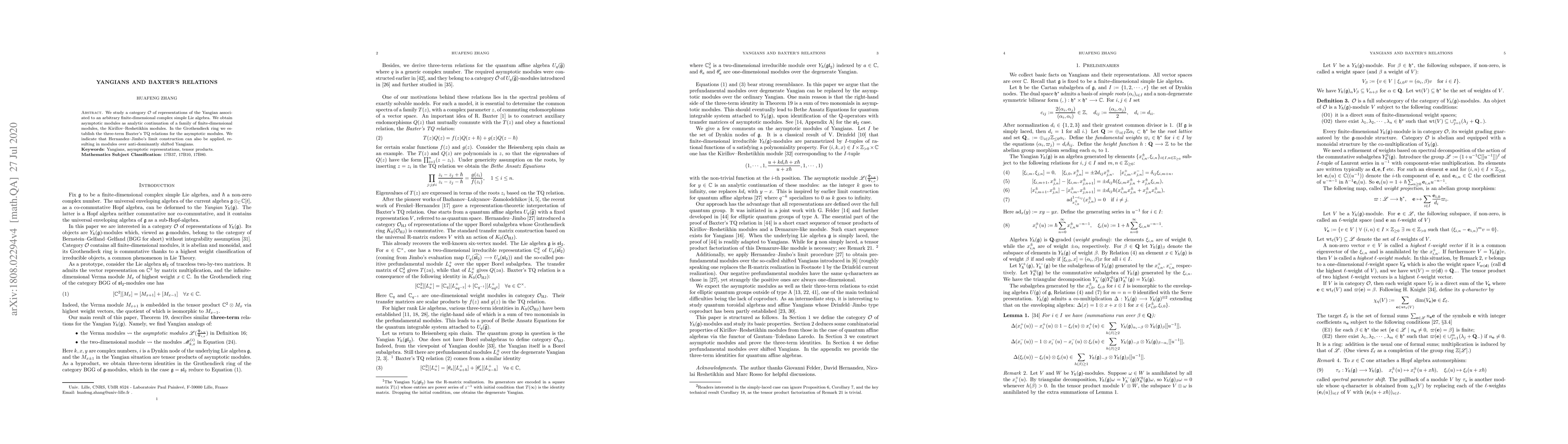 We study a category O of representations of the Yangian associated to an arbitrary finite-dimensional complex simple Lie algebra. We obtain asymptotic modules as analytic continuation of a family of finite-dimensional modules, the Kirillov--Reshetikhin modules. In the Grothendieck ring we establish the three-term Baxter's TQ relations for the asymptotic modules. We indicate that Hernandez--Jimbo's limit construction can also be applied, resulting in modules over anti-dominantly shifted Yangians.