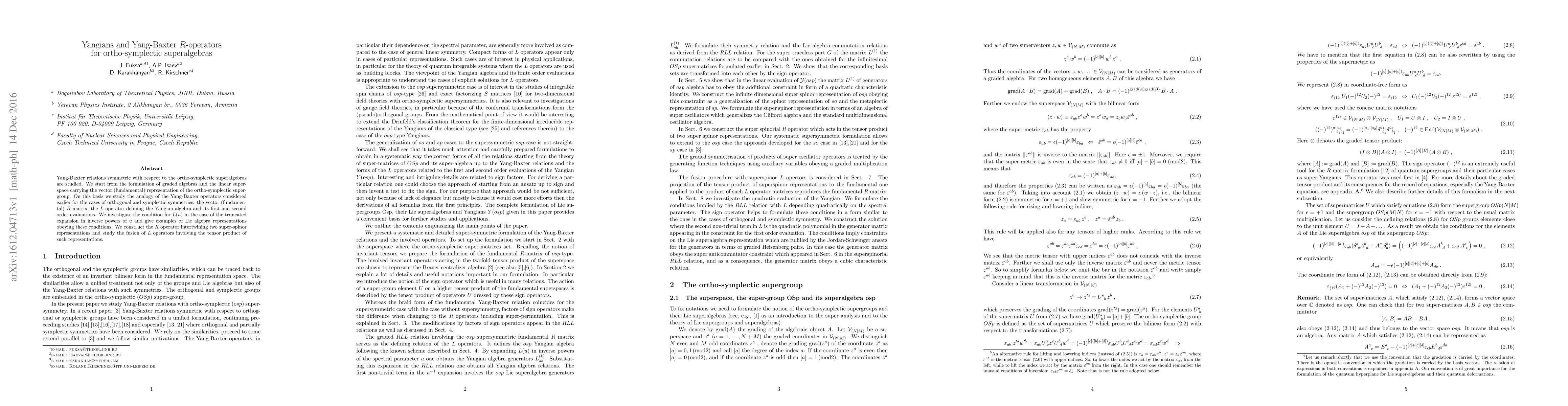 Yang-Baxter relations symmetric with respect to the ortho-symplectic superalgebras are studied. We start from the formulation of graded algebras and the linear superspace carrying the vector (fundamental) representation of the ortho-symplectic supergroup. On this basis we study the analogy of the Yang-Baxter operators considered earlier for the cases of orthogonal and symplectic symmetries: the vector (fundamental) R matrix, the L operator defining the Yangian algebra and its first and second order evaluations. We investigate the condition for L(u) in the case of the truncated expansion in inverse powers of u and give examples of Lie algebra representations obeying these conditions. We construct the R operator intertwining two super-spinor representations and study the fusion of L operators involving the tensor product of such representations.