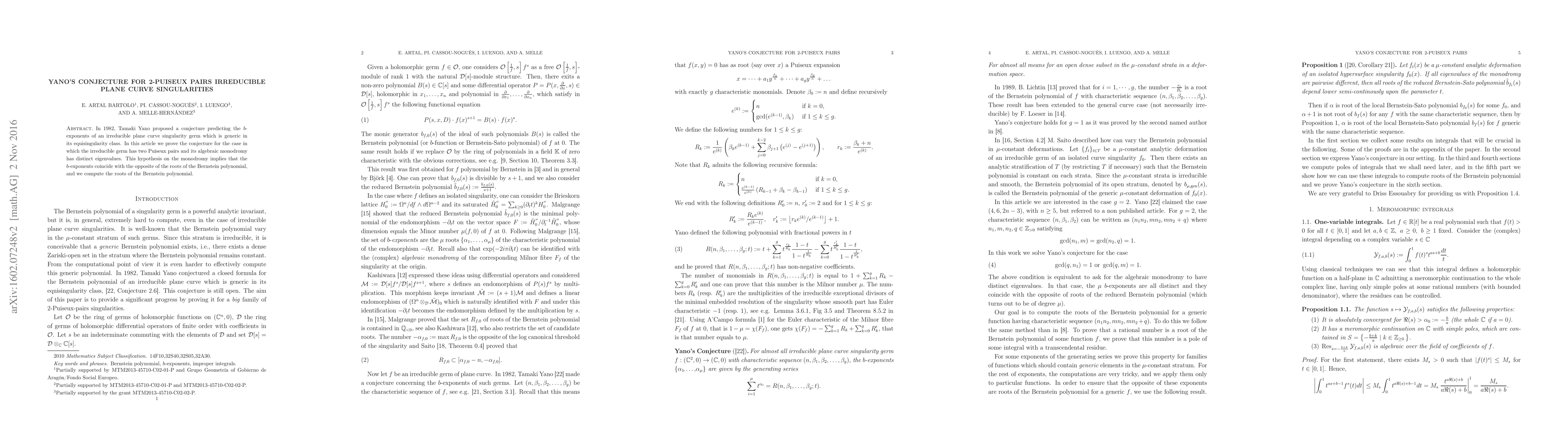 Yano's conjecture regarding the $b$-exponents of irreducible plane curve singularities is proven for the case of two Puiseux pairs and monodromy with distinct eigenvalues. The $b$-exponents are shown to coincide with the negative roots of the Bernstein polynomial.