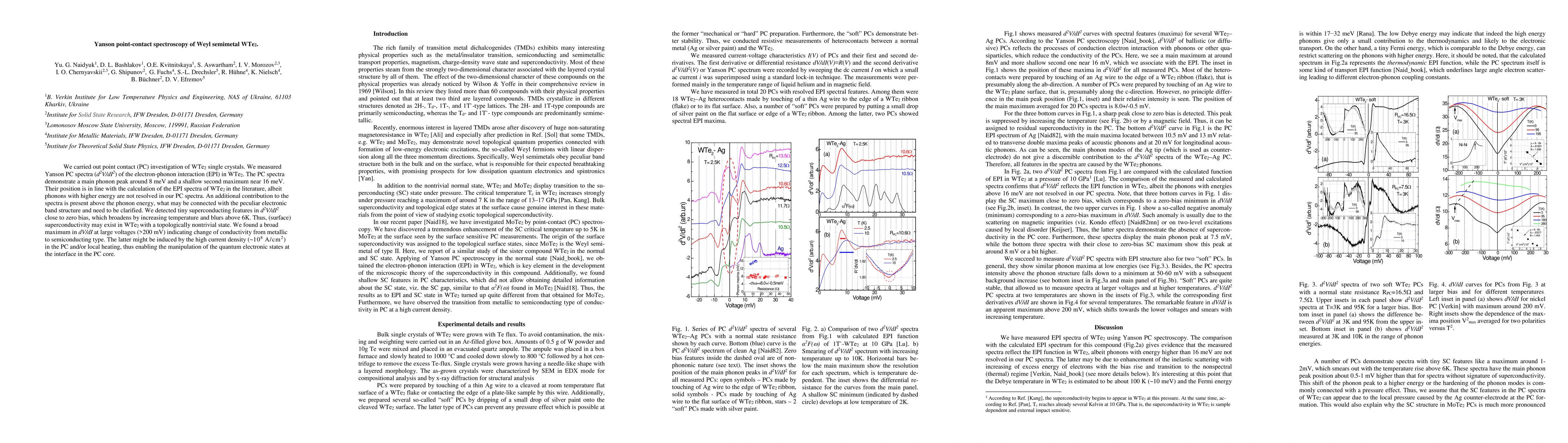 We carried out point contact (PC) investigation of WTe2 single crystals. We measured Yanson d2V/dI2 PC spectra of the electron-phonon interaction (EPI) in WTe2. The spectra demonstrate a main phonon peak around 8 meV and a shallow second maximum near 16 meV. Their position is in line with the calculation of the EPI spectra of WTe2 in the literature, albeit phonons with higher energy are not resolved in our PC spectra. An additional contribution to the spectra is present above the phonon energy, what may be connected with the peculiar electronic band structure and need to be clarified. We detected tiny superconducting features in d2V/dI2 close to zero bias, which broadens by increasing temperature and blurs above 6K. Thus, (surface) superconductivity may exist in WTe2 with a topologically nontrivial state. We found a broad maximum in dV/dI at large voltages (>200 mV) indicating change of conductivity from metallic to semiconducting type. The latter might be induced by the high current density (~10^8 A/cm^2) in the PC and/or local heating, thus enabling the manipulation of the quantum electronic states at the interface in the PC core.