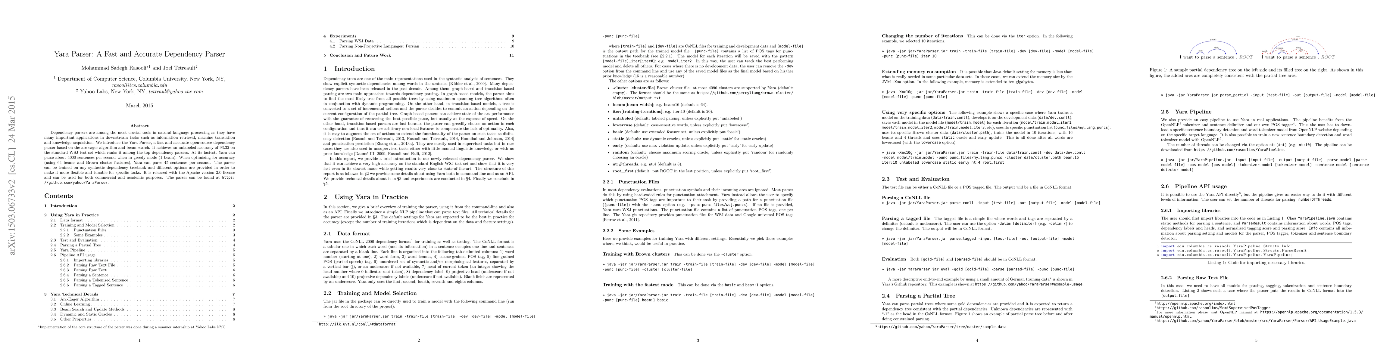 The Yara Parser is a high-performance, open-source dependency parser utilizing the arc-eager algorithm and beam search, achieving top-tier accuracy and speed. It can parse up to 4000 sentences per second in greedy mode and 45 sentences per second with optimized accuracy settings.
