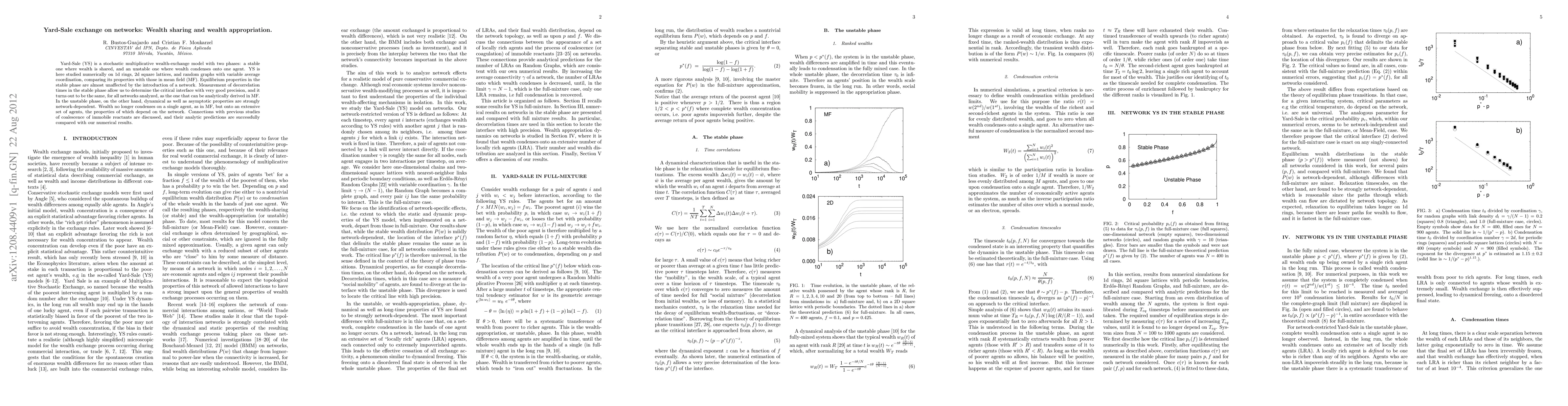Yard-Sale (YS) is a stochastic multiplicative wealth-exchange model with two phases: a stable one where wealth is shared, and an unstable one where wealth condenses onto one agent. YS is here studied numerically on 1d rings, 2d square lattices, and random graphs with variable average coordination, comparing its properties with those in mean field (MF). Equilibrium properties in the stable phase are almost unaffected by the introduction of a network. Measurement of decorrelation times in the stable phase allow us to determine the critical interface with very good precision, and it turns out to be the same, for all networks analyzed, as the one that can be analytically derived in MF. In the unstable phase, on the other hand, dynamical as well as asymptotic properties are strongly network-dependent. Wealth no longer condenses on a single agent, as in MF, but onto an extensive set of agents, the properties of which depend on the network. Connections with previous studies of coalescence of immobile reactants are discussed, and their analytic predictions are successfully compared with our numerical results.