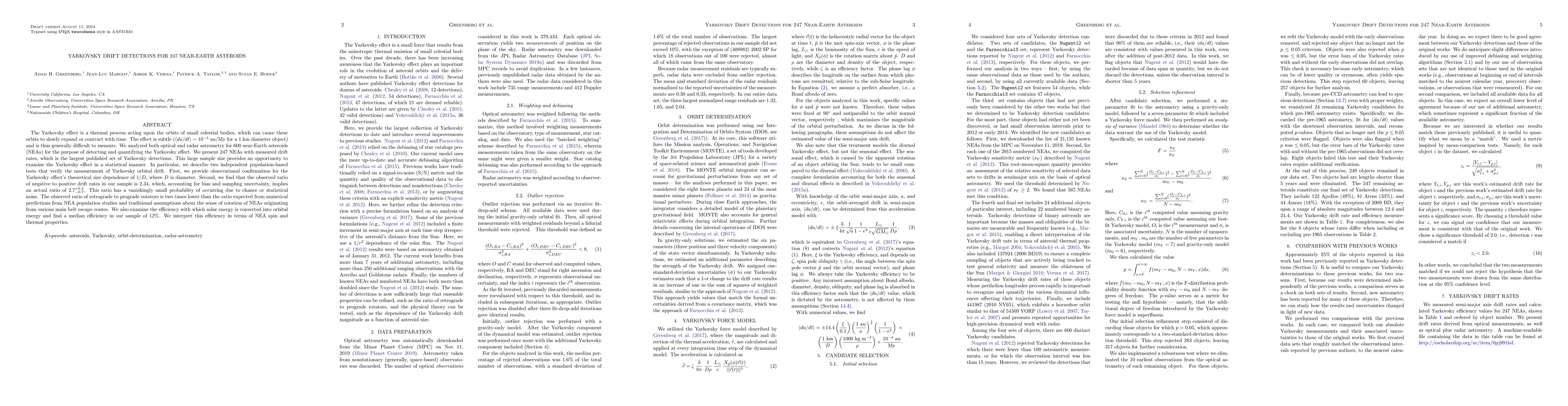 The Yarkovsky effect is a thermal process acting upon the orbits of small celestial bodies, which can cause these orbits to slowly expand or contract with time. The effect is subtle (da/dt ~ 10^-4 au/My for a 1 km diameter object) and is thus generally difficult to measure. We analyzed both optical and radar astrometry for 600 near-Earth asteroids (NEAs) for the purpose of detecting and quantifying the Yarkovsky effect. We present 247 NEAs with measured drift rates, which is the largest published set of Yarkovsky detections. This large sample size provides an opportunity to examine the Yarkovsky effect in a statistical manner. In particular, we describe two independent population-based tests that verify the measurement of Yarkovsky orbital drift. First, we provide observational confirmation for the Yarkovsky effect's theoretical size dependence of 1/D, where D is diameter. Second, we find that the observed ratio of negative to positive drift rates in our sample is 2.34, which, accounting for bias and sampling uncertainty, implies an actual ratio of $2.7^{+0.3}_{-0.7}$. This ratio has a vanishingly small probability of occurring due to chance or statistical noise. The observed ratio of retrograde to prograde rotators is two times lower than the ratio expected from numerical predictions from NEA population studies and traditional assumptions about the sense of rotation of NEAs originating from various main belt escape routes. We also examine the efficiency with which solar energy is converted into orbital energy and find a median efficiency in our sample of 12%. We interpret this efficiency in terms of NEA spin and thermal properties.