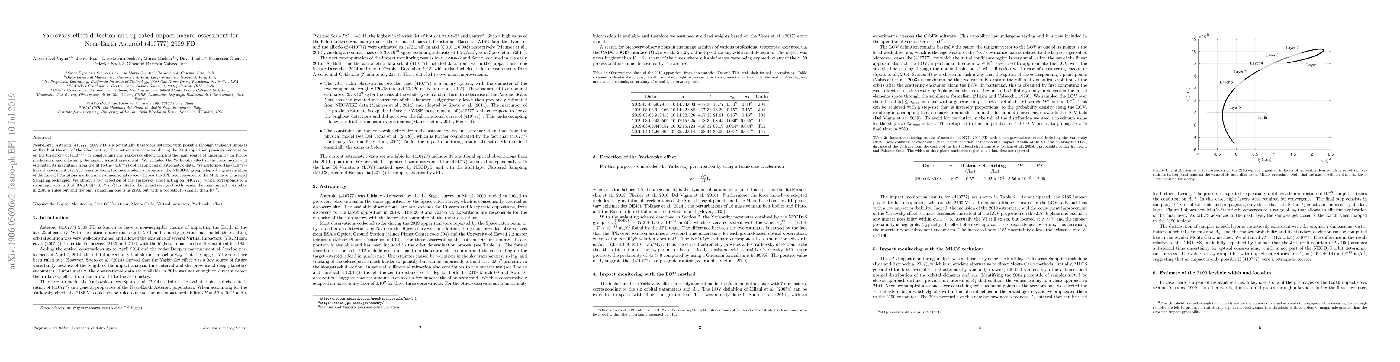 Near-Earth asteroid (410777) 2009 FD is a potentially hazardous asteroid with potential impacts on Earth at the end of the 22nd century. The astrometry collected during the 2019 apparition provides information on the trajectory of (410777) by constraining the Yarkovsky effect, which is the main source of uncertainty for future predictions, and informing the impact hazard assessment. We included the Yarkovsky effect in the force model and estimated its magnitude from the fit to the (410777) optical and radar astrometric data. We performed the (410777) hazard assessment over 200 years by using two independent approaches: the NEODyS group adopted a generalisation of the Line Of Variations method in a 7-dimensional space, whereas the JPL team resorted to the Multilayer Clustered Sampling technique. We obtain a 4-sigma detection of the Yarkovsky effect acting on (410777), which corresponds to a semimajor axis drift of (3.6 +/- 0.9) x 10^{-3} au/Myr. As for the hazard results of both teams, the main impact possibility in 2185 is ruled out and the only remaining one is in 2190, but with a probability smaller than 10^{-8}.