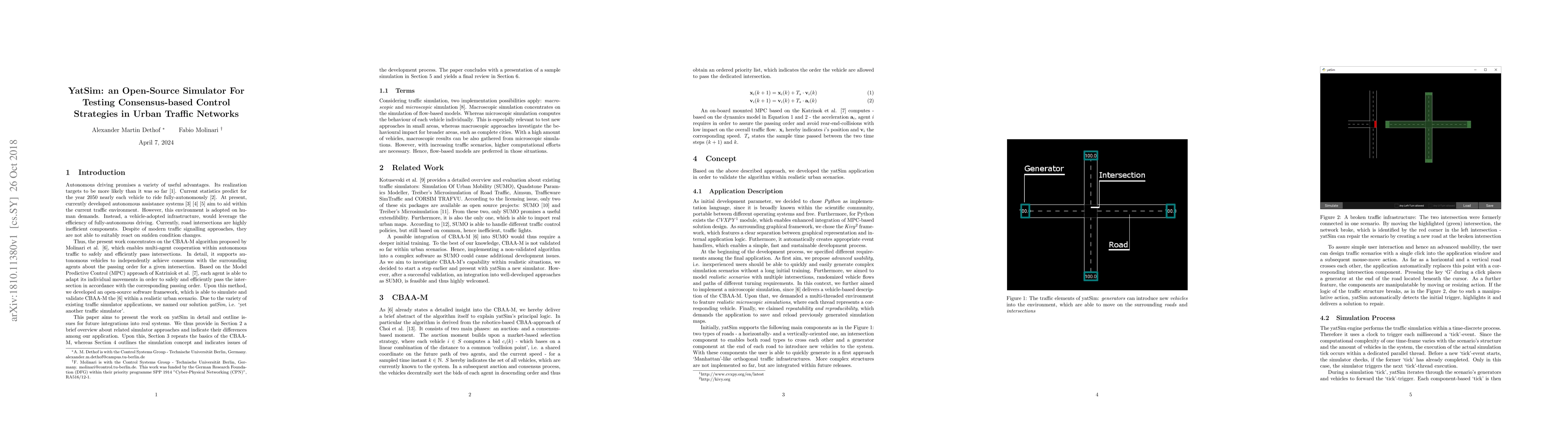 YatSim is an open-source simulator for testing consensus-based control strategies in urban traffic networks, employing a Consensus-Based Auction Algorithm Modified to ensure vehicle agreement on crossing priorities. It uses a Model Predictive Controller to avoid collisions, aiming for improved performance, safety, and efficiency.