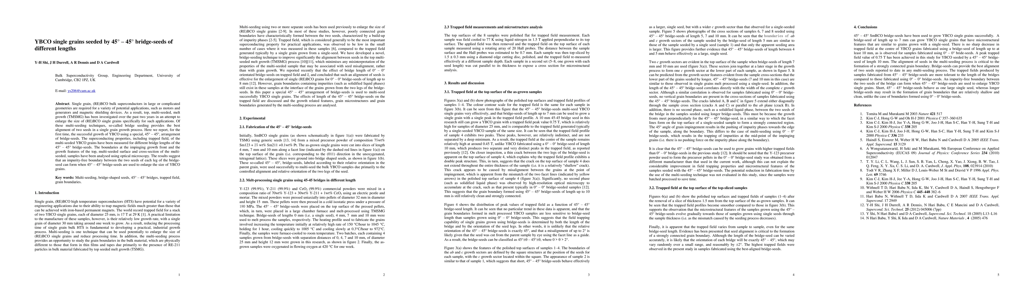 Single grain, (RE)BCO bulk superconductors in large or complicated geometries are required for a variety of potential applications, such as motors and generators and magnetic shielding devices. As a result, top, multi-seeded, melt growth (TMSMG) has been investigated over the past two years in an attempt to enlarge the size of (RE)BCO single grains specifically for such applications. Of these multi-seeding techniques, so-called bridge seeding provides the best alignment of two seeds in a single grain growth process. Here we report, for the first time, the successful growth of YBCO using a special, 45{\deg} - 45{\deg}, arrangement of bridge-seeds. The superconducting properties, including trapped field, of the multi-seeded YBCO grains have been measured for different bridge lengths of the 45{\deg}- 45{\deg} bridge-seeds. The boundaries at the impinging growth front and the growth features of the top, multi-seeded surface and cross-section of the multi-seeded, samples have been analysed using optical microscopy. The results suggest that an impurity-free boundary between the two seeds of each leg of the bridge-seed can form when 45{\deg}- 45{\deg} bridge-seeds are used to enlarge the size of YBCO grains.