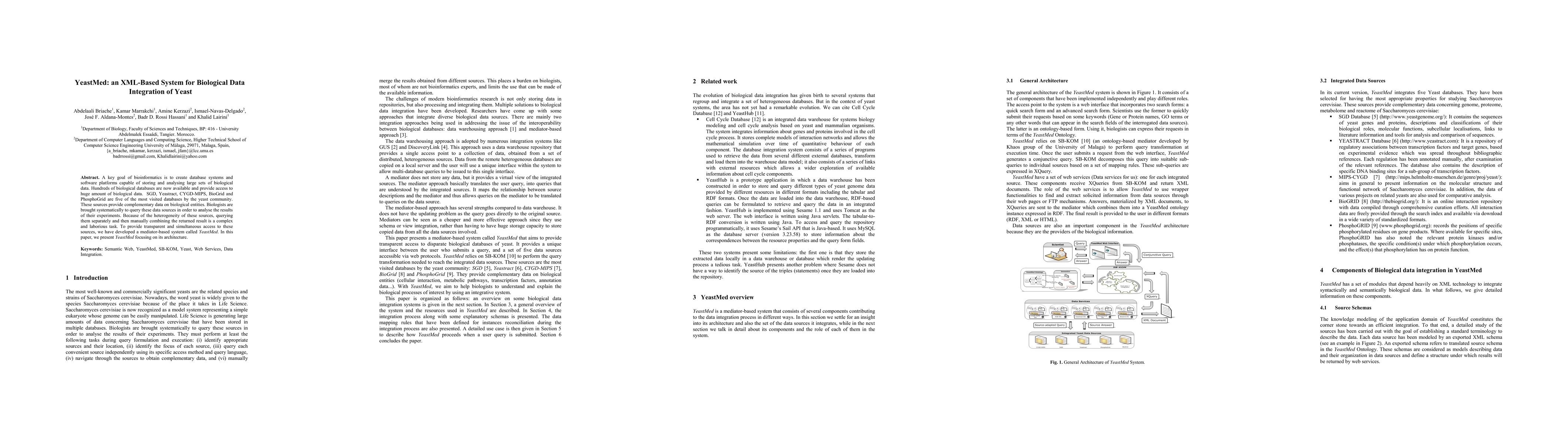 A key goal of bioinformatics is to create database systems and software platforms capable of storing and analysing large sets of biological data. Hundreds of biological databases are now available and provide access to huge amount of biological data. SGD, Yeastract, CYGD-MIPS, BioGrid and PhosphoGrid are five of the most visited databases by the yeast community. These sources provide complementary data on biological entities. Biologists are brought systematically to query these data sources in order to analyse the results of their experiments. Because of the heterogeneity of these sources, querying them separately and then manually combining the returned result is a complex and laborious task. To provide transparent and simultaneous access to these sources, we have developed a mediator-based system called YeastMed. In this paper, we present YeastMed focusing on its architecture.