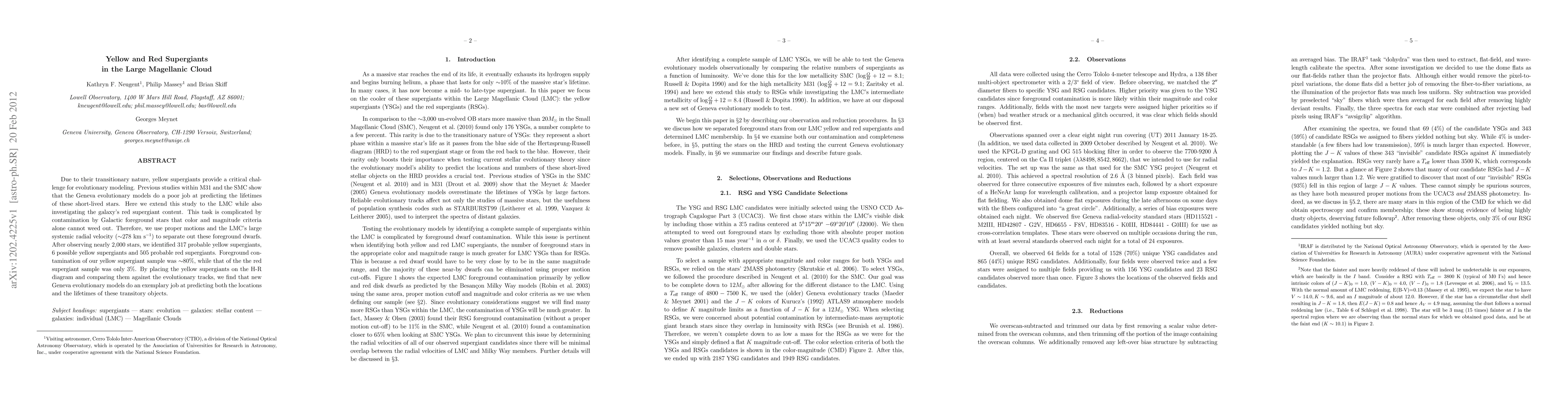 This paper investigates yellow and red supergiants in the Large Magellanic Cloud, identifying 317 probable yellow supergiants and 505 probable red supergiants while minimizing Galactic foreground contamination. The study finds that new Geneva evolutionary models accurately predict the locations and lifetimes of yellow supergiants, unlike previous models.